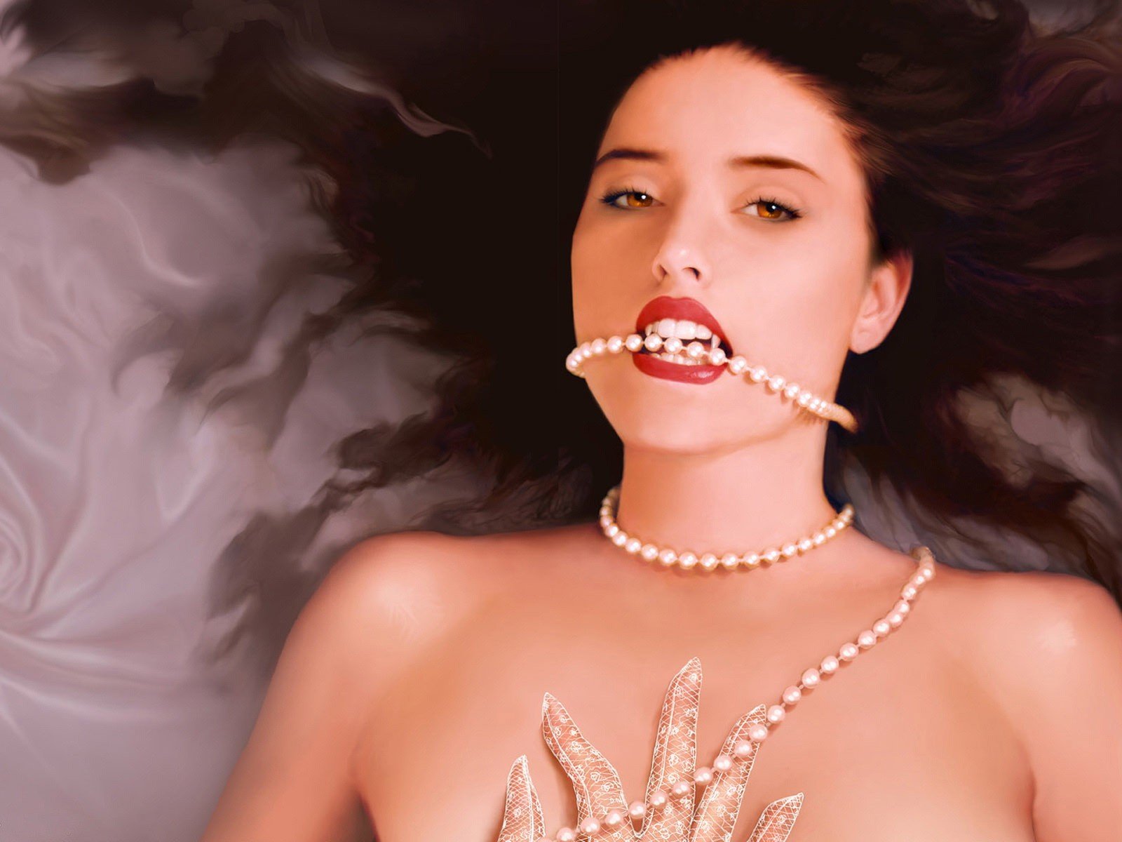 Art dziewczyny z czerwoną szminką na ustach i dłoniach