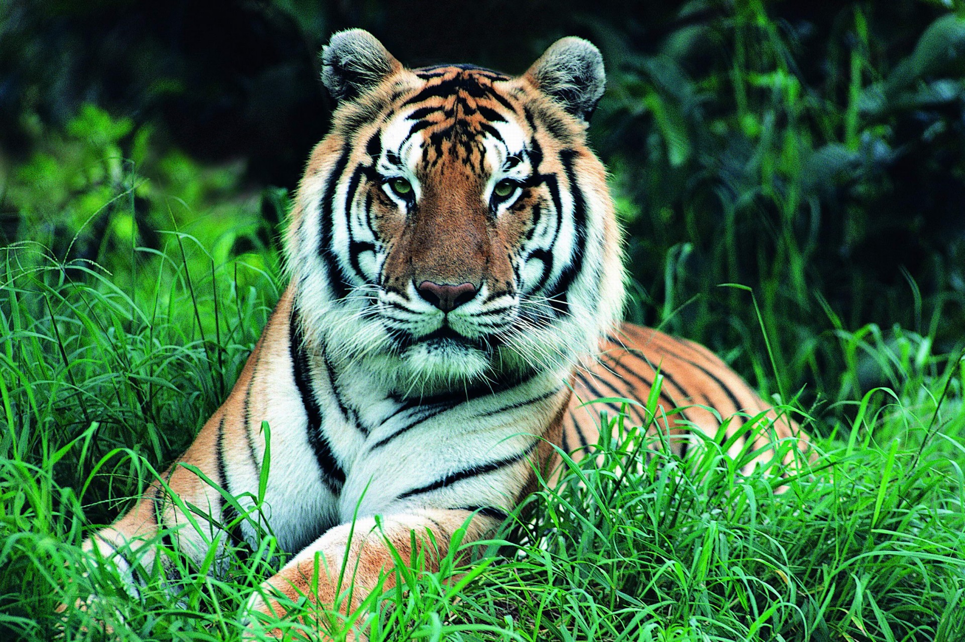 Tygrys sumatrzański odpoczywa w pozycji leżącej