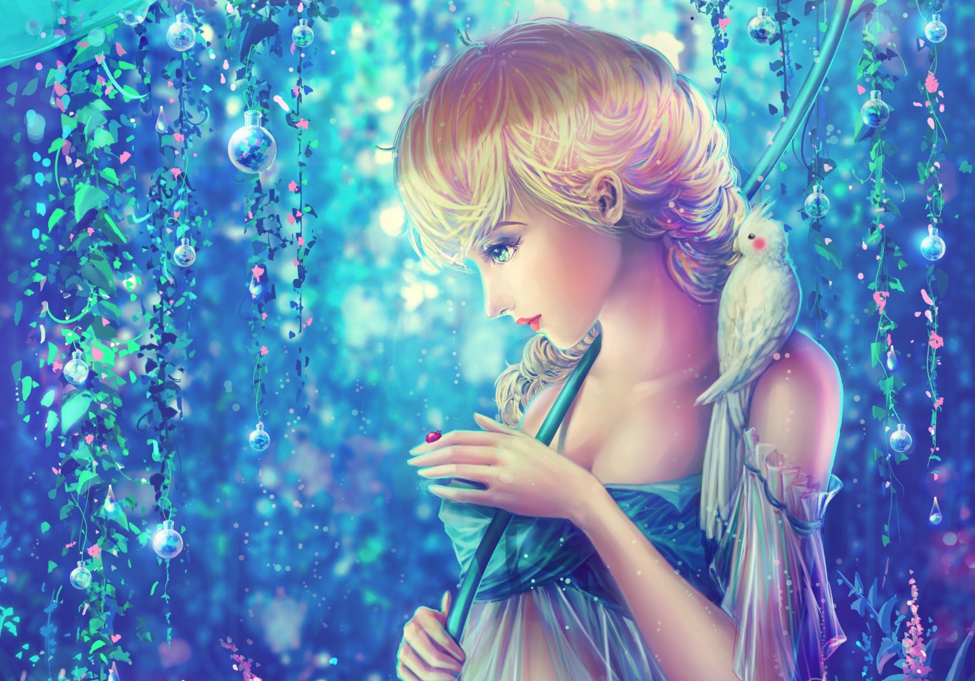 Dziewczyna z papugą na ramieniu patrzy na biedronkęDziewczyna z papugą na ramieniu patrzy na biedronkę