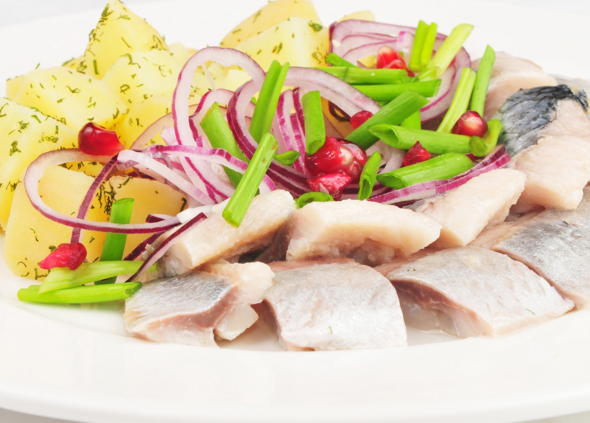 Na planszy leżą cebulki w pierścieniach, na stole obok leżą ziemniaki, jest czarny chleb, a na planszy leży śledź