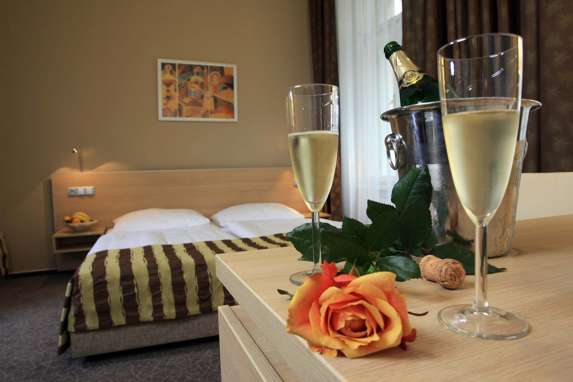 Dwa kieliszki szampana w otoczeniu pokoju