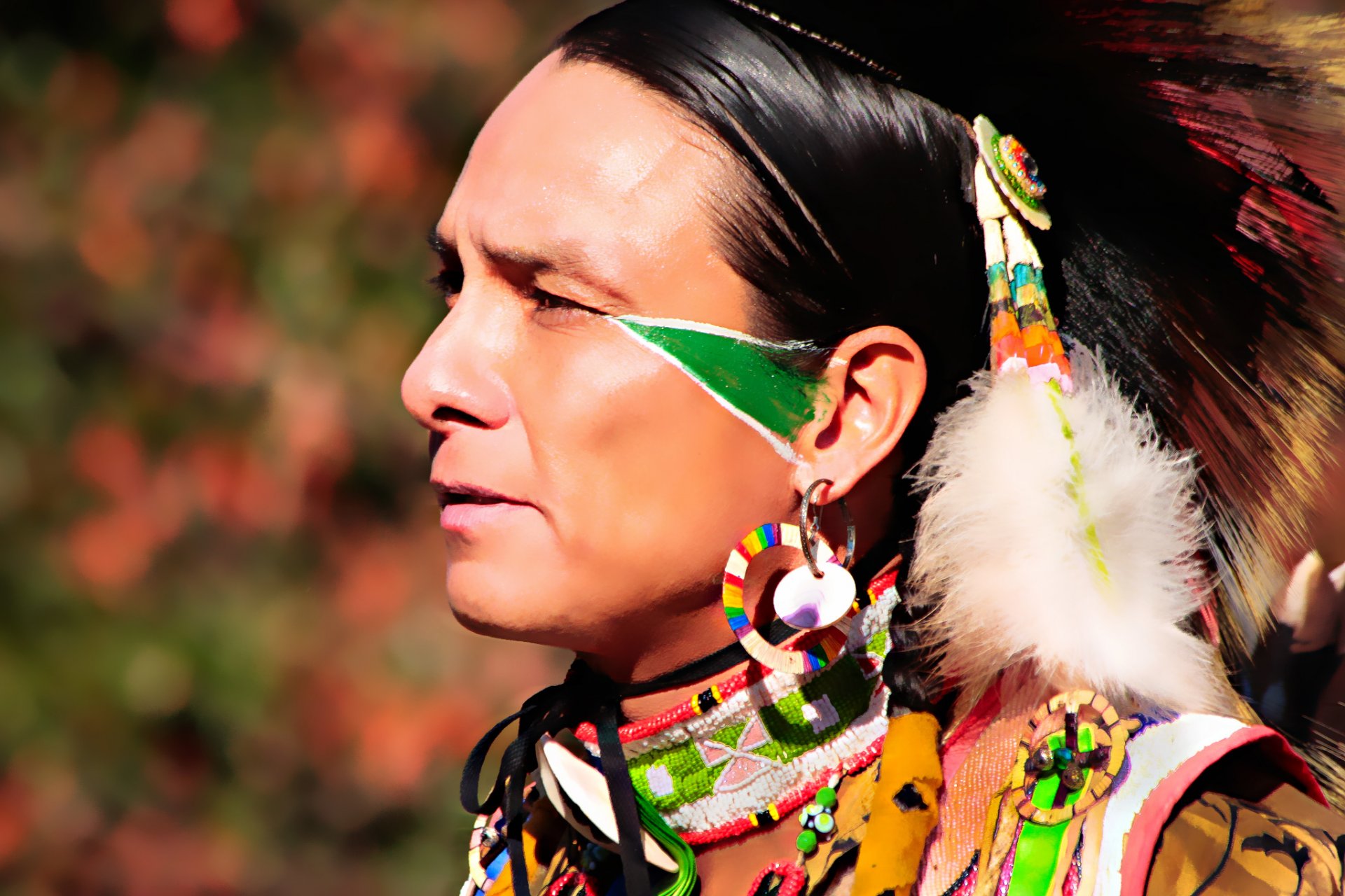 Mężczyzna Indianin w piórach i malowanej twarzy