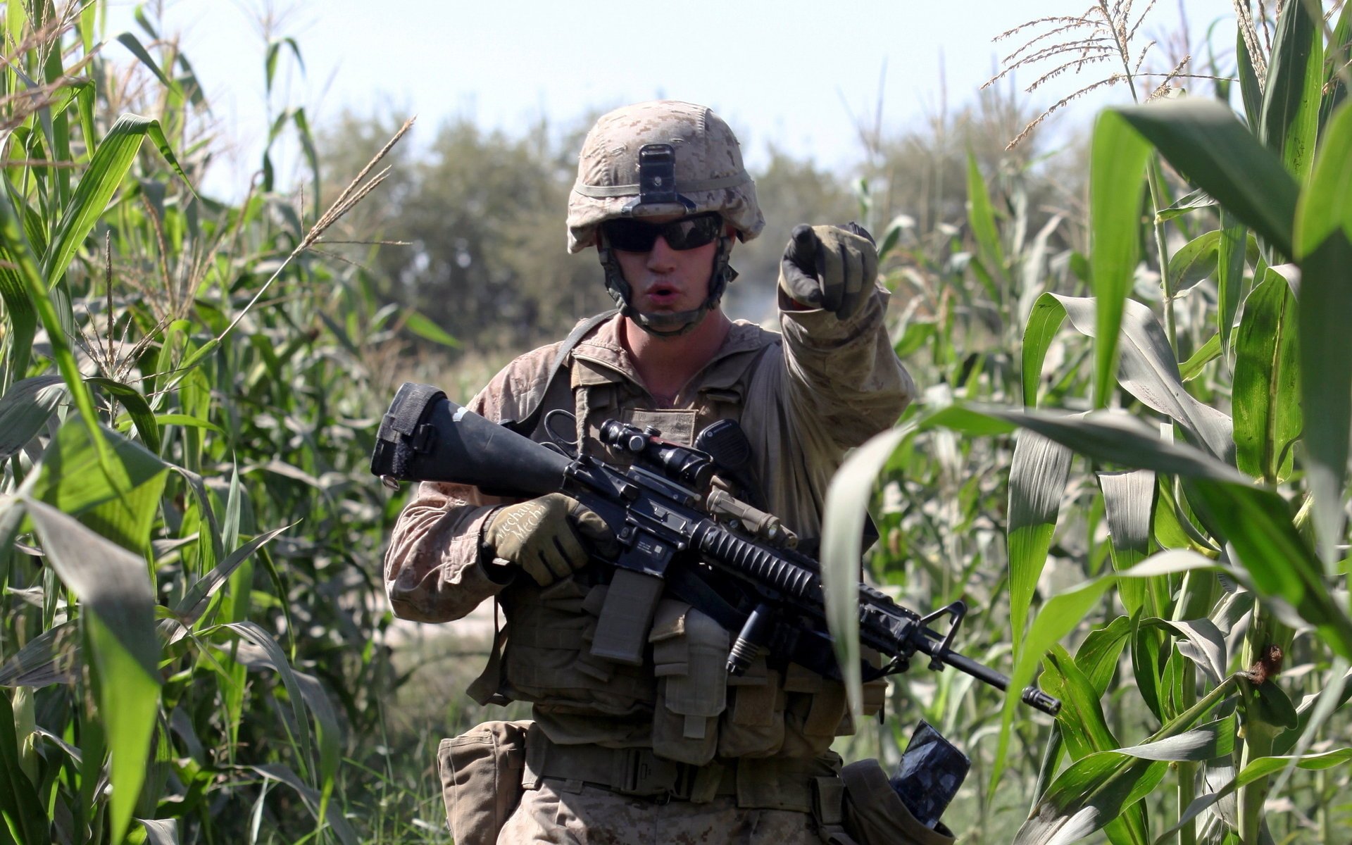 Żołnierz z karabinem maszynowym na polu kukurydzy