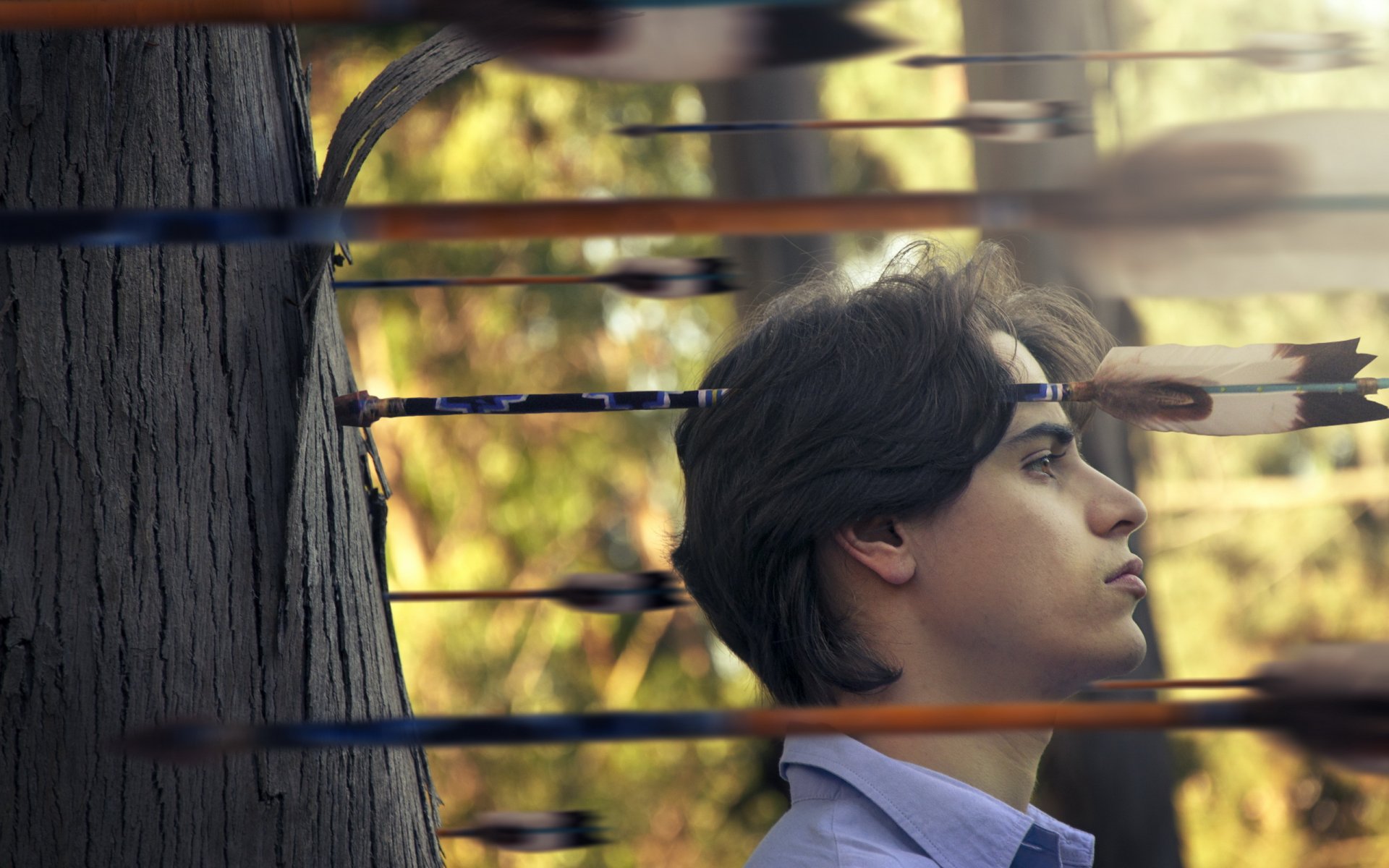 Facet w czerwonej koszulce patrzy w niebo w pobliżu białej ściany