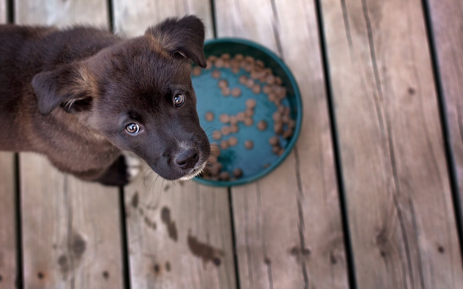 Szczeniak po jedzeniu z wdzięcznym spojrzeniem