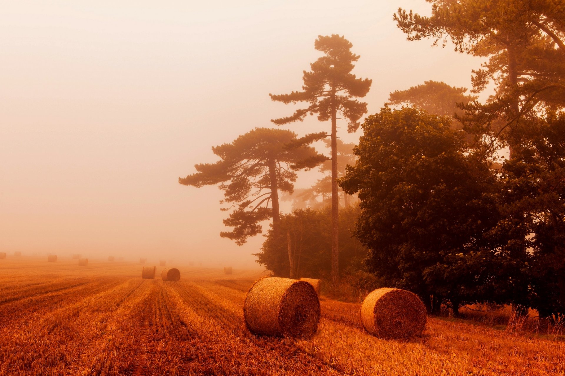 Stog siana na polu we mgle