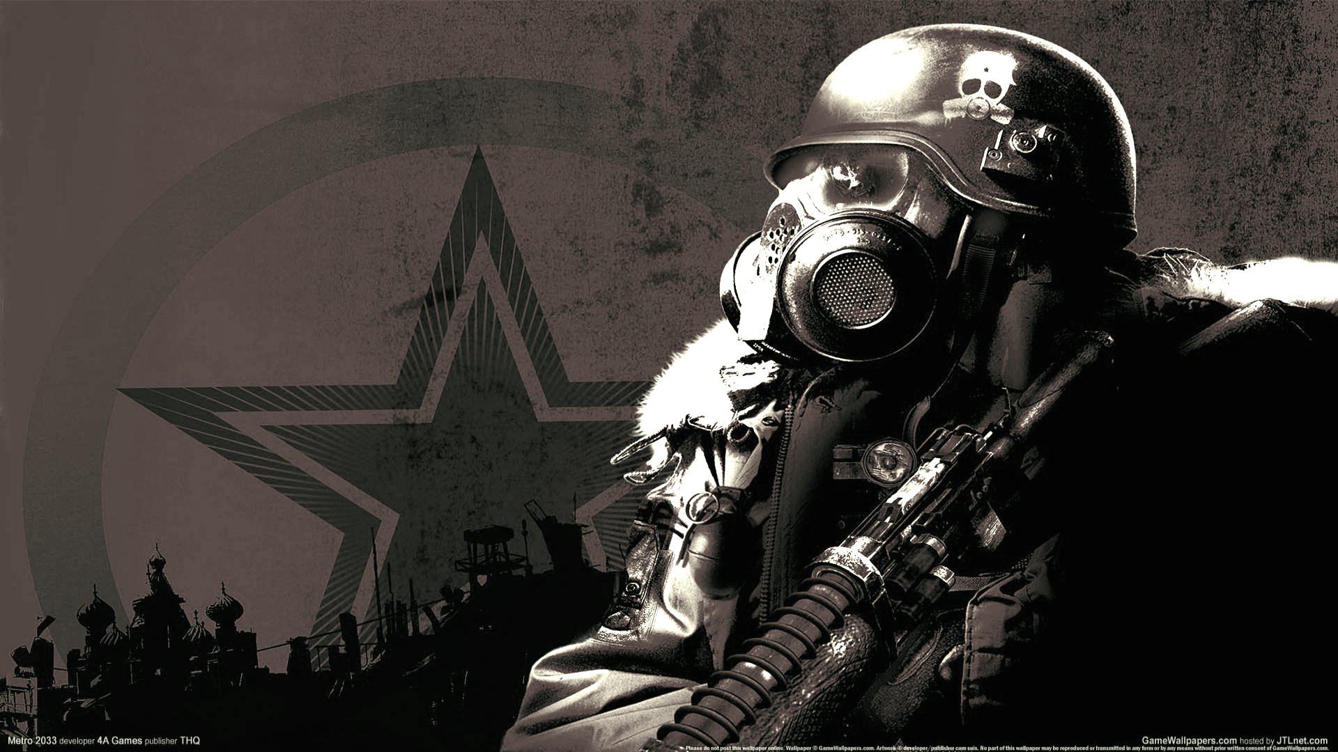 Metro 2033. mężczyzna w masce gazowej patrzy na ostatnie światło