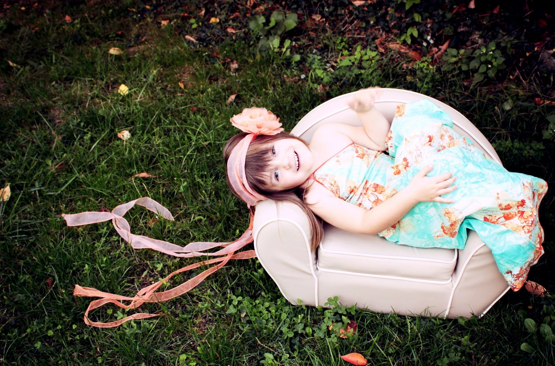 Dziewczyna z wstążkami na głowie leży na krześle w naturze
