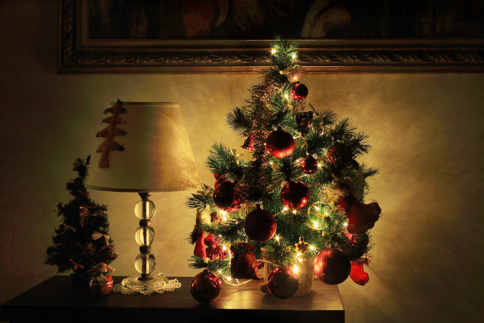 Uchylone drzwi prowadzące do pokoju z choinką i prezentamiUchylone drzwi prowadzące do pokoju z choinką i prezentami