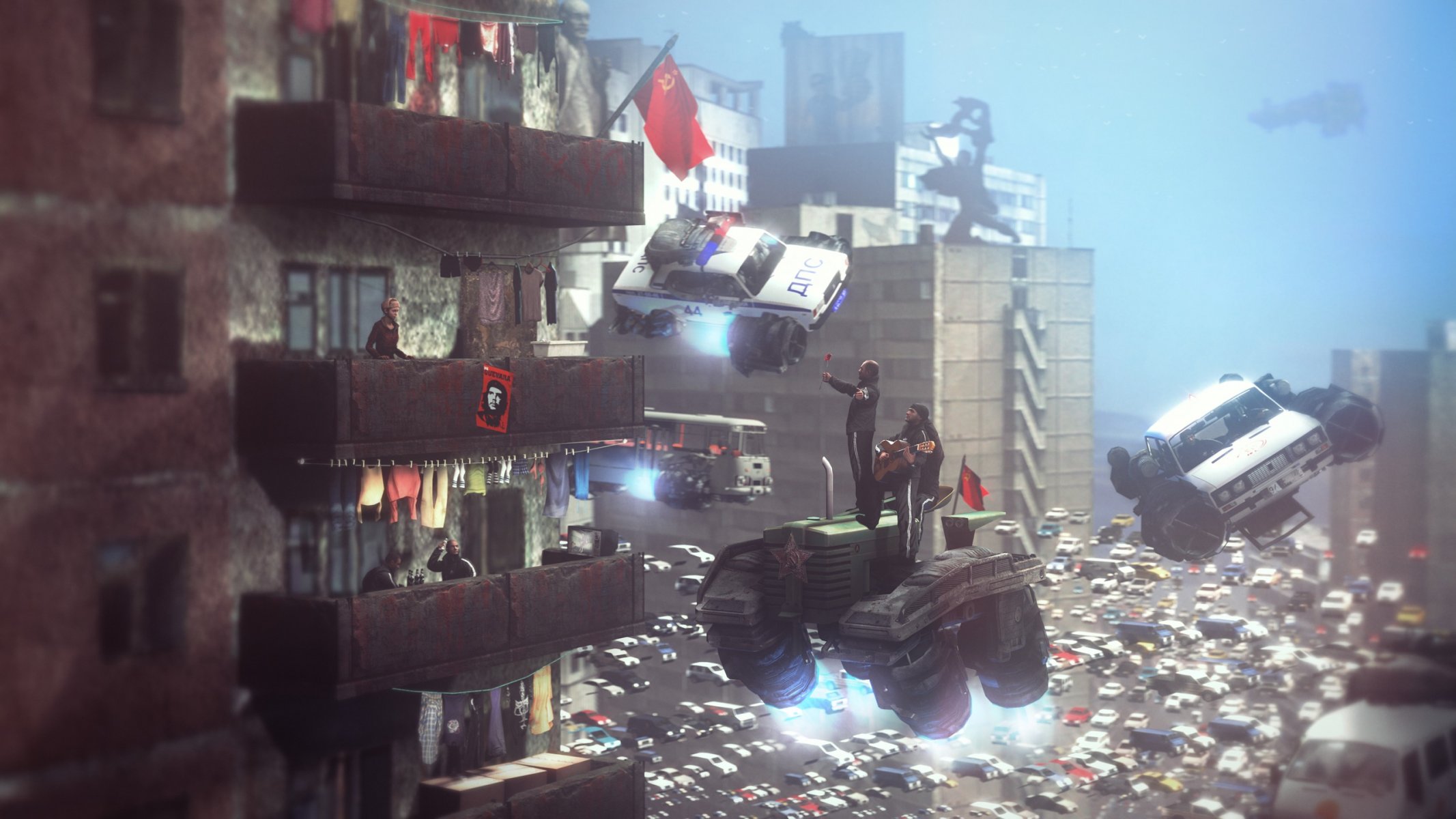 Dziewczyna na balkonie w zniszczonym domu i mężczyźni w transporcie wojskowym