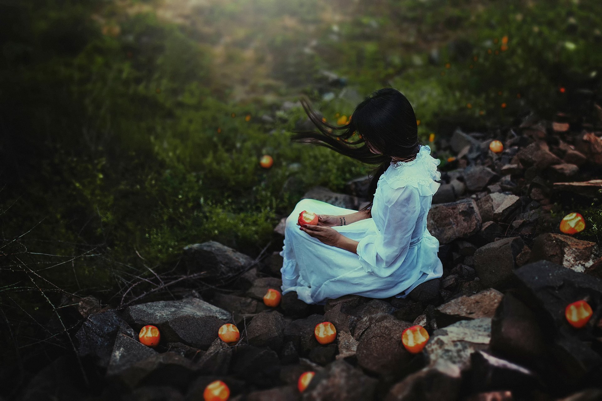 Dziewczyna w białej sukience siedząca na kamieniach z jabłkiem w ręku