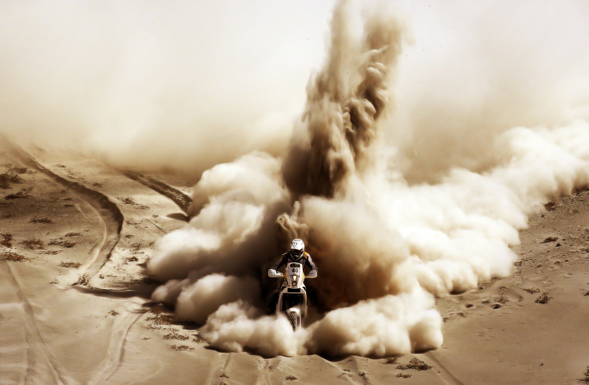 Motocyklista jedzie przez pustynię, rozpędzając piasek w różnych kierunkach ogromną kolumną dymu