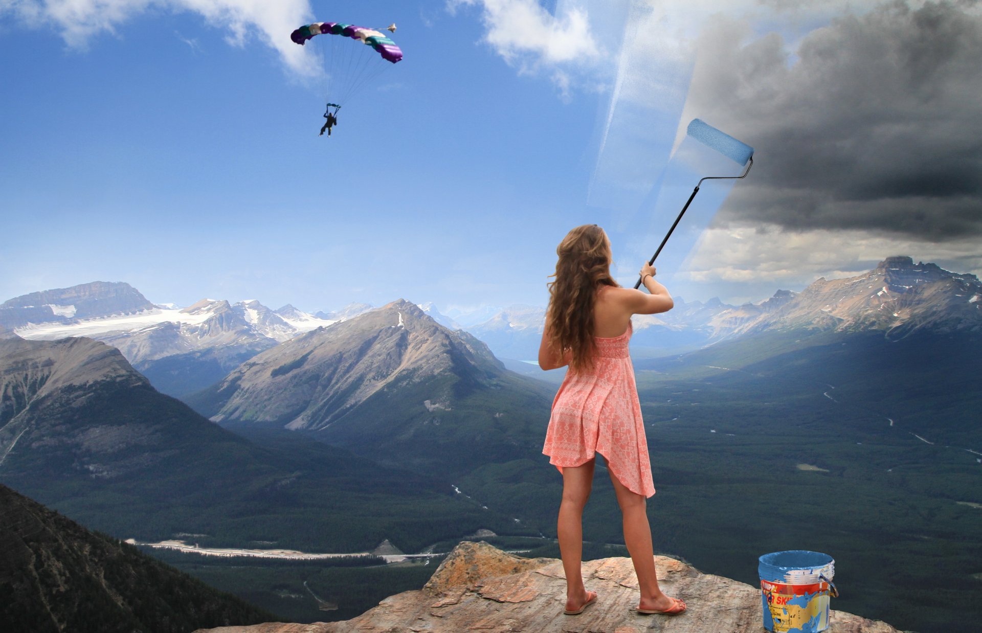 Dziewczyna rysuje na niebie wielobarwną tęczę
