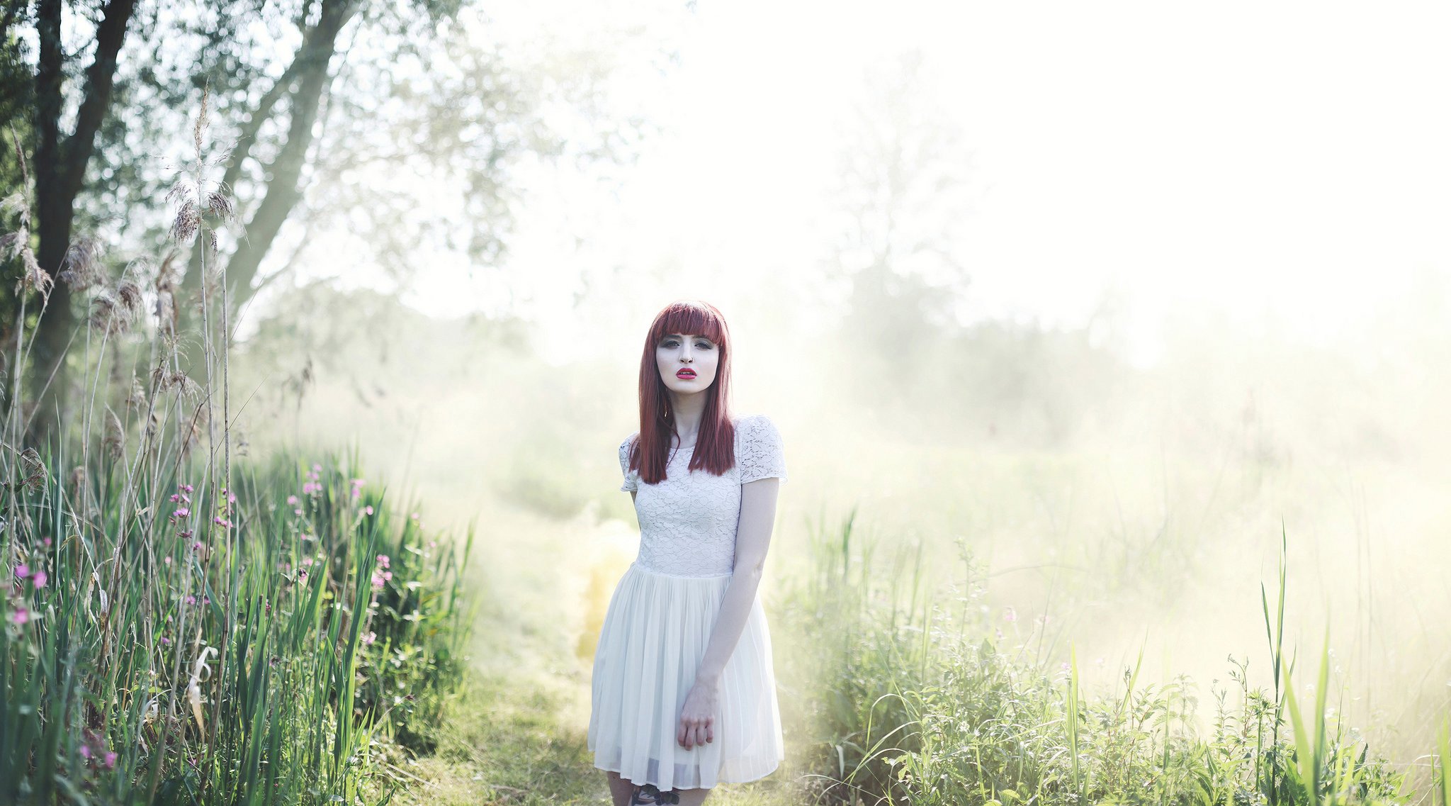 Ruda perwersyjna dziewczyna z niebieskimi oczami w lesie