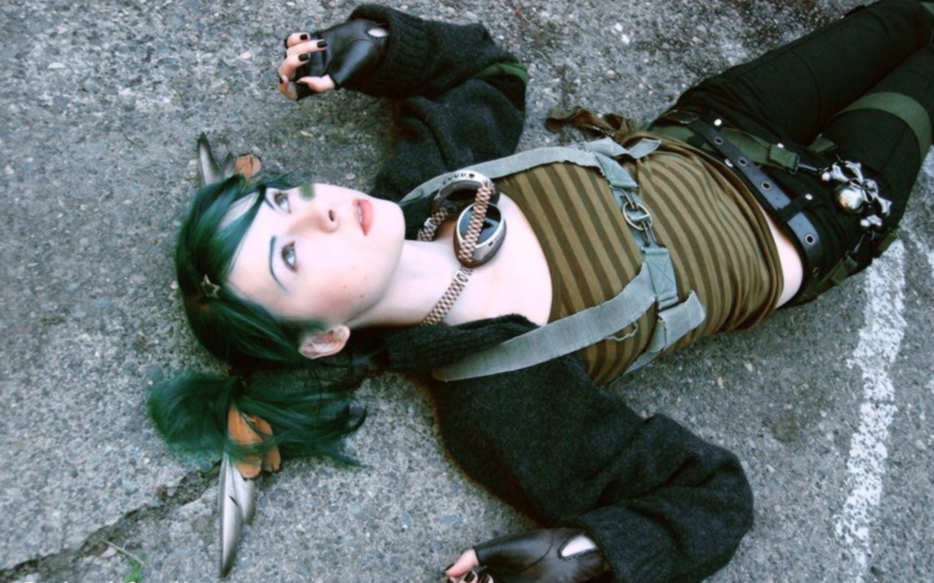 Nogi w czerwonych mieszkaniach dziewczyny na ławce w dżinsowej spódnicy z aparatem i dzianinową torbą w dłoniachNogi w czerwonych mieszkaniach dziewczyny na ławce w dżinsowej spódnicy z aparatem i dzianinową torbą w dłoniach