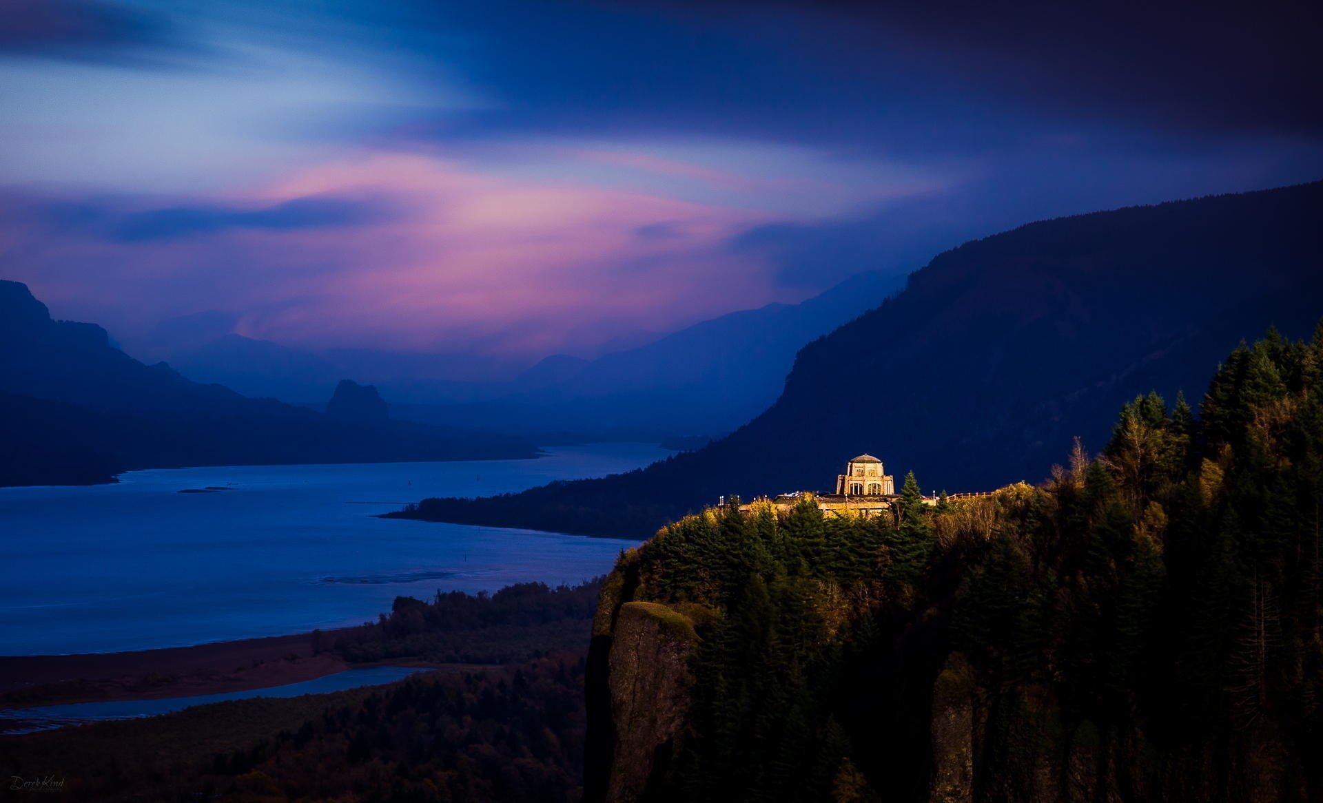 Samochód volvo wśród gór i śniegu o zmierzchu