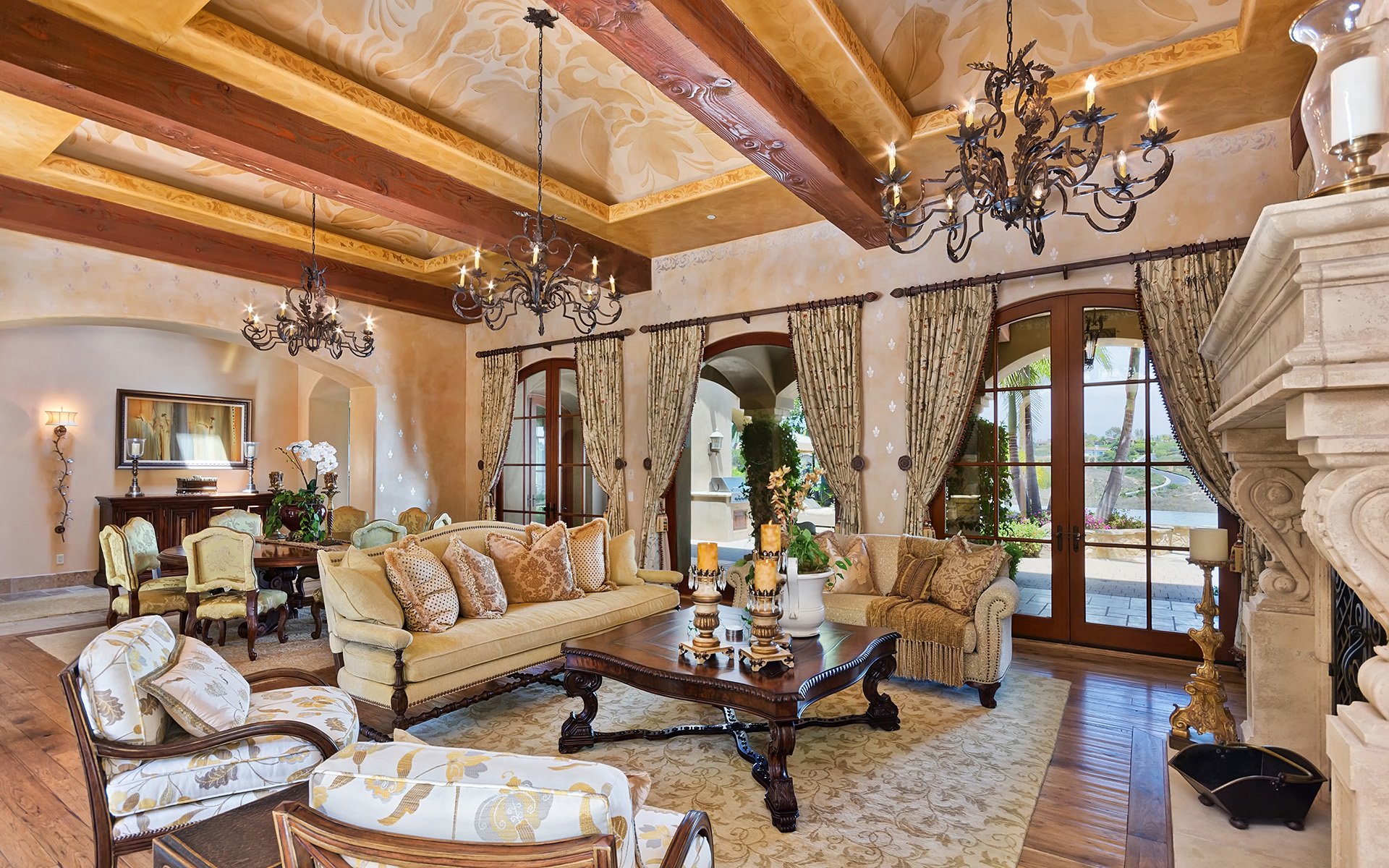 Jasny salon z witrażowymi oknami i oszałamiającymi widokamiJasny salon z witrażowymi oknami i oszałamiającymi widokami