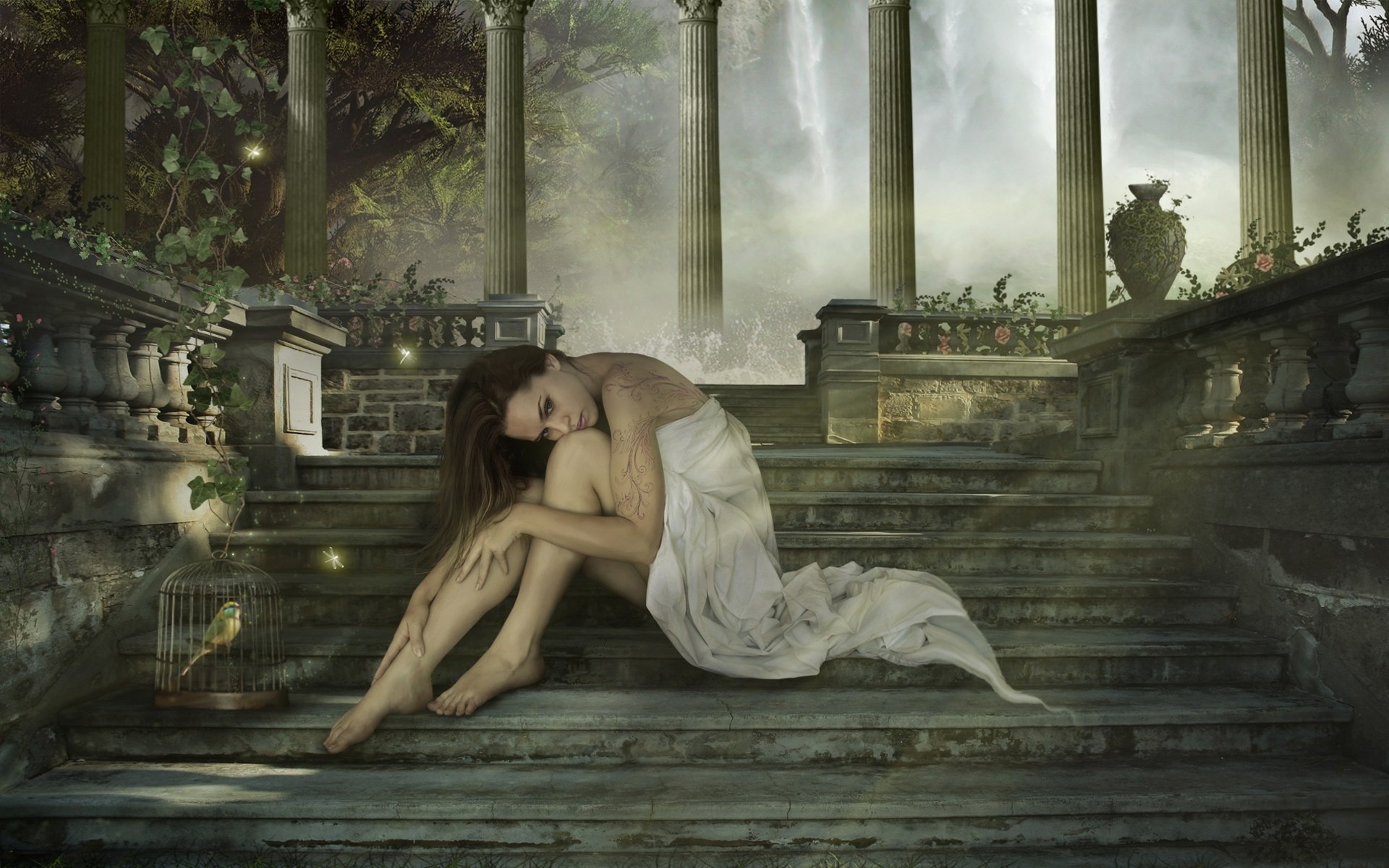 Dziewczyna z ptakiem na schodach w pobliżu kolumn