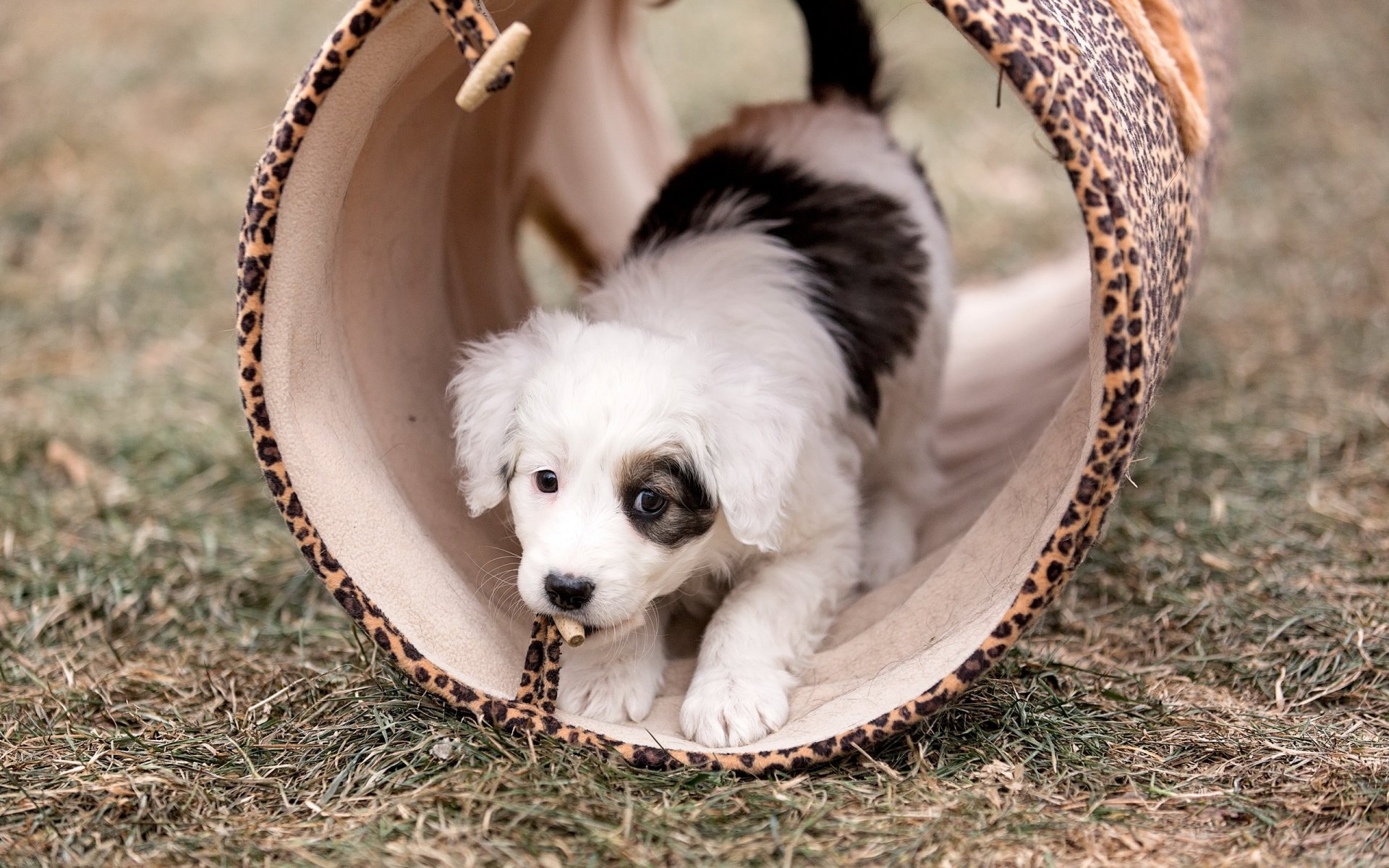 Przerażony wygląd szczeniaka na trawie