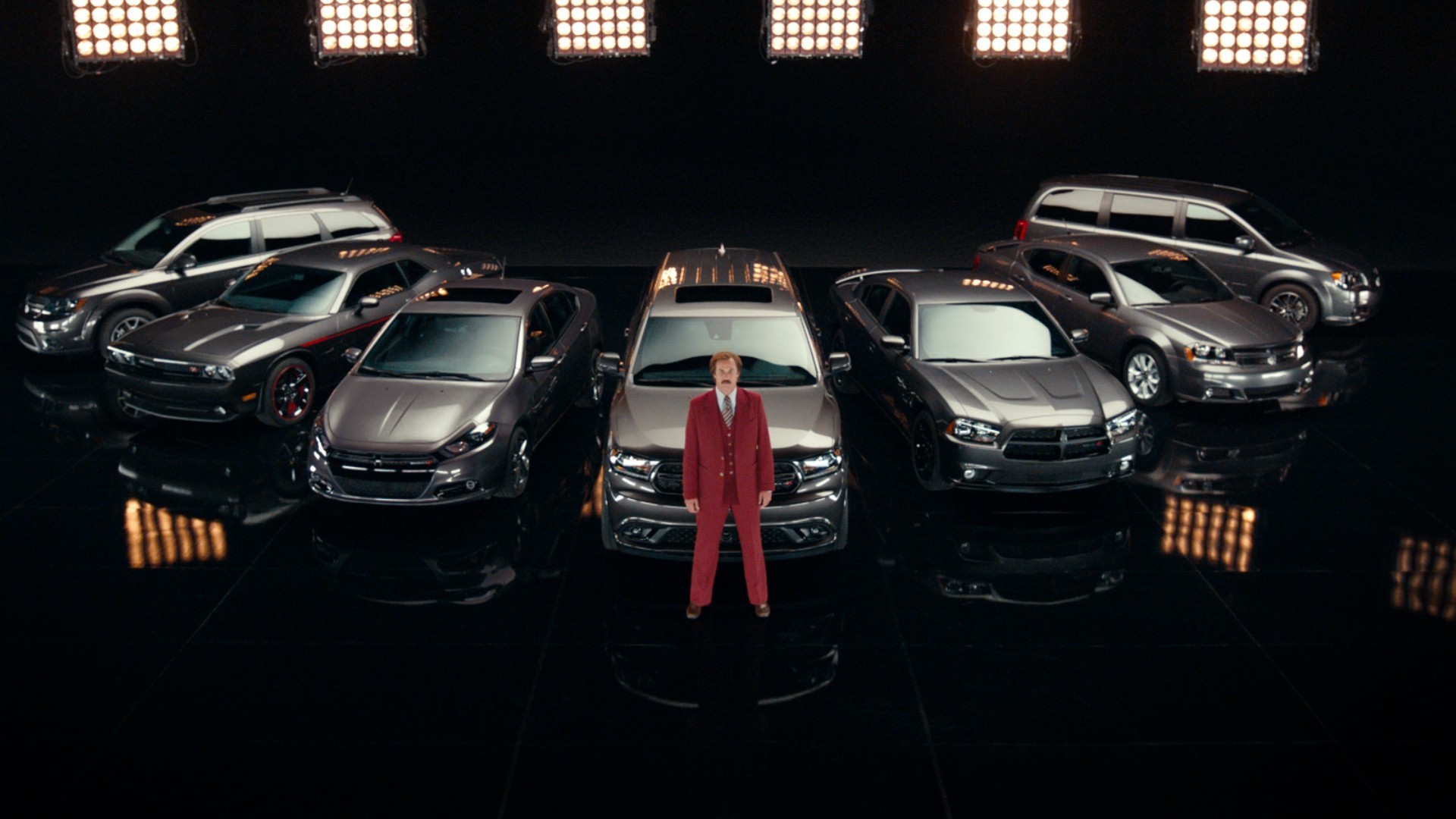 Siedem samochodów tego samego koloru i mężczyzna w czerwonym garniturze