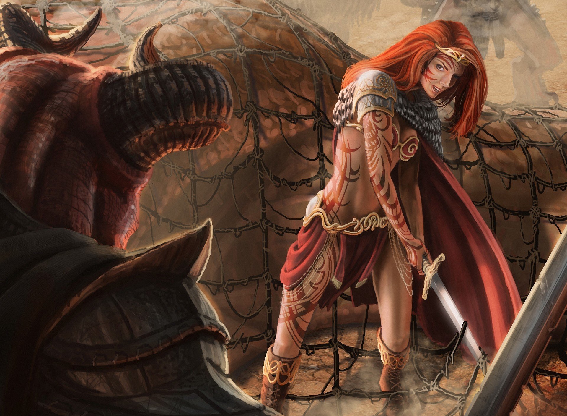 Dziewczyna z mieczem patrzy w stronę rogatego stworzenia