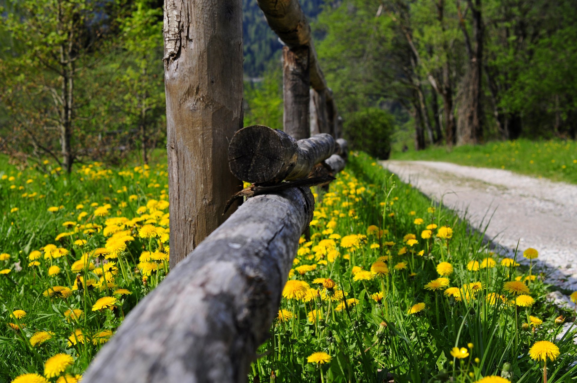 Pole mniszka lekarskiego w pobliżu wiejskiej drogi