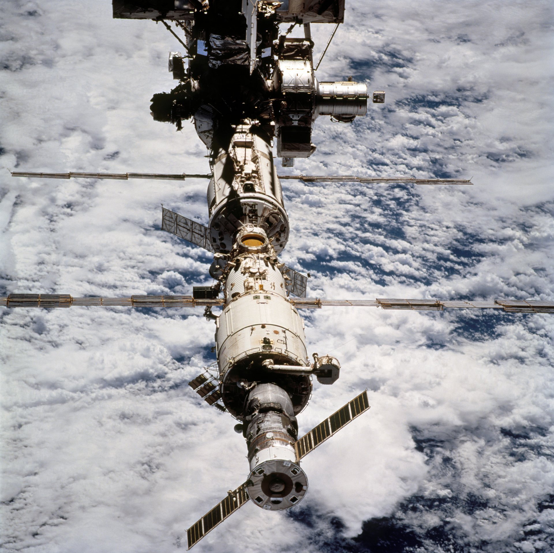 Dokowanie wahadłowca i ISS na tle chmur ziemskiej atmosfery i czarnej przestrzeni