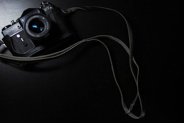 Aparat, lśniący obiektywem, leży na czarnym tle