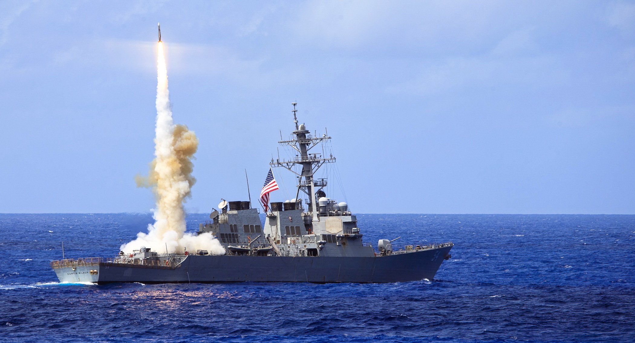 Potwór i strażnicy z łukami obserwują statek płynący w dół rzeki między skałami
