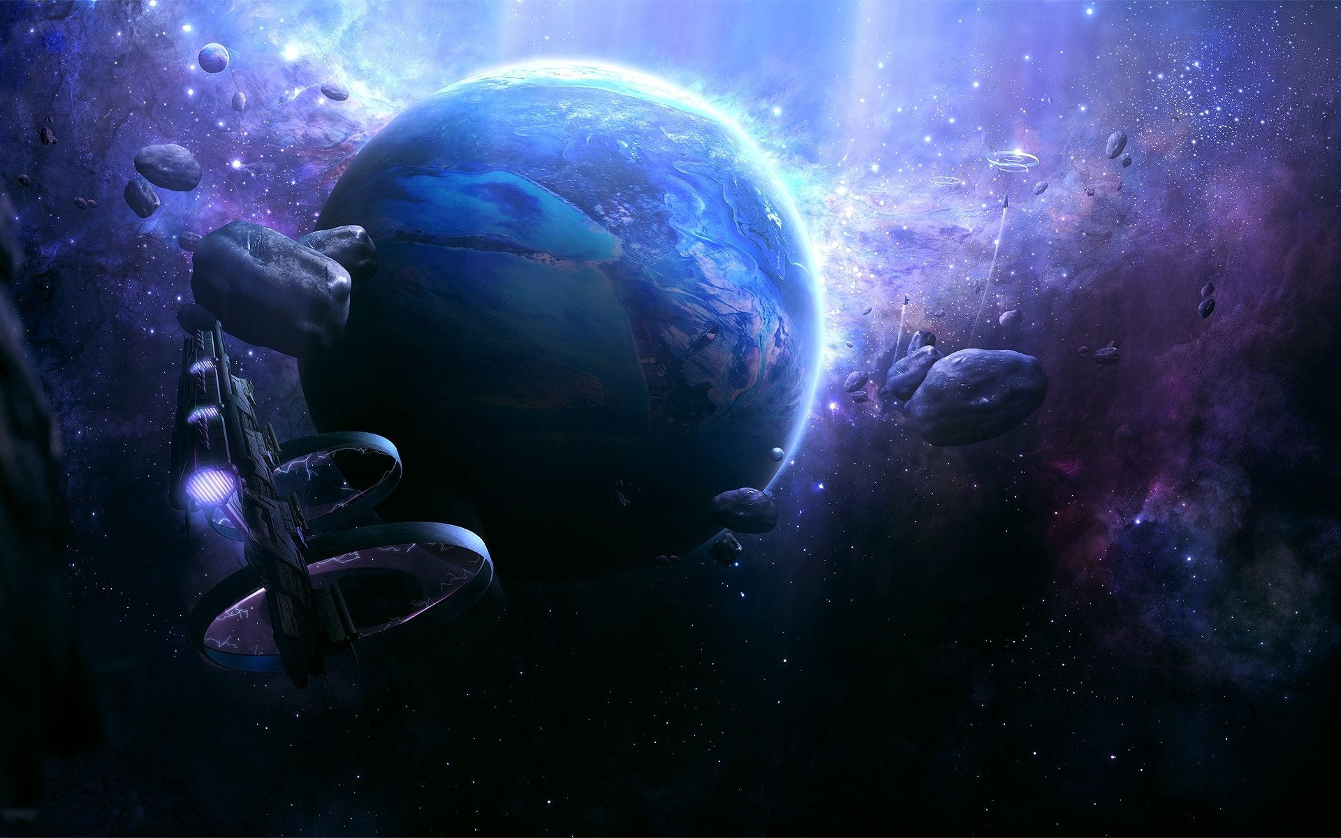 Planeta Ziemia. Przyszłość. Planetoida. Kosmiczne śmieci. Satelita. Zielona planeta. Statki kosmiczne. Księżyc