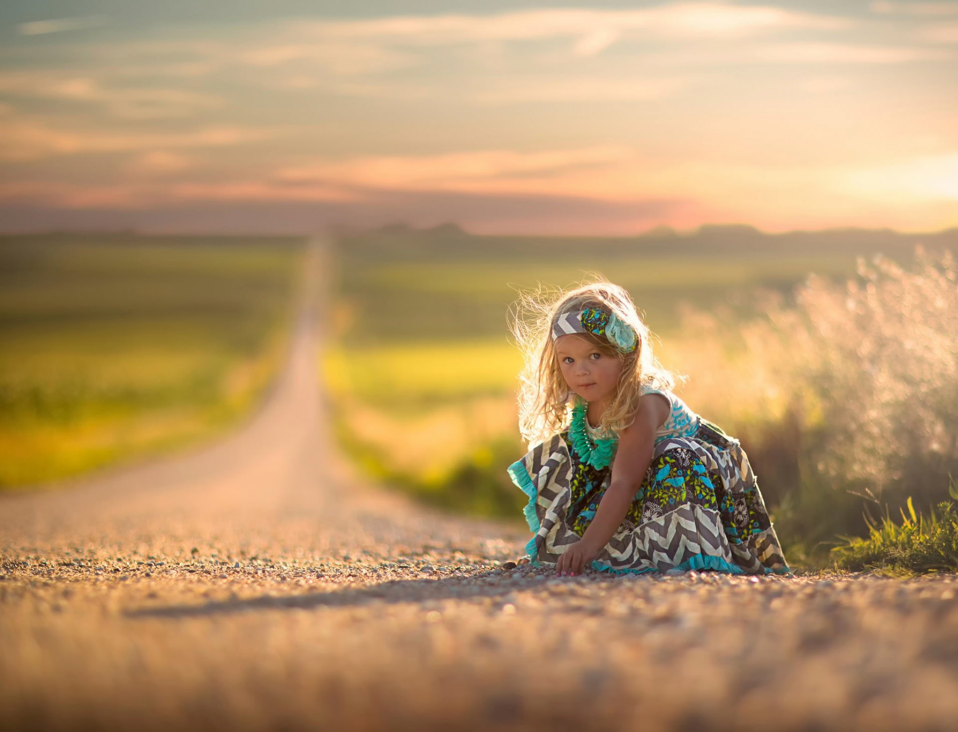 Dziewczyna siedzi na drodze wiatr pęcznieje jej włosy