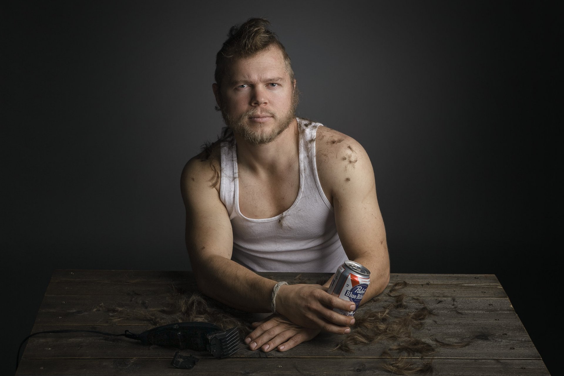Krótko strzyżona dziewczyna opiera się na czerwonym samochodzie na tle zieleni i pociąguKrótko strzyżona dziewczyna opiera się na czerwonym samochodzie na tle zieleni i pociągu