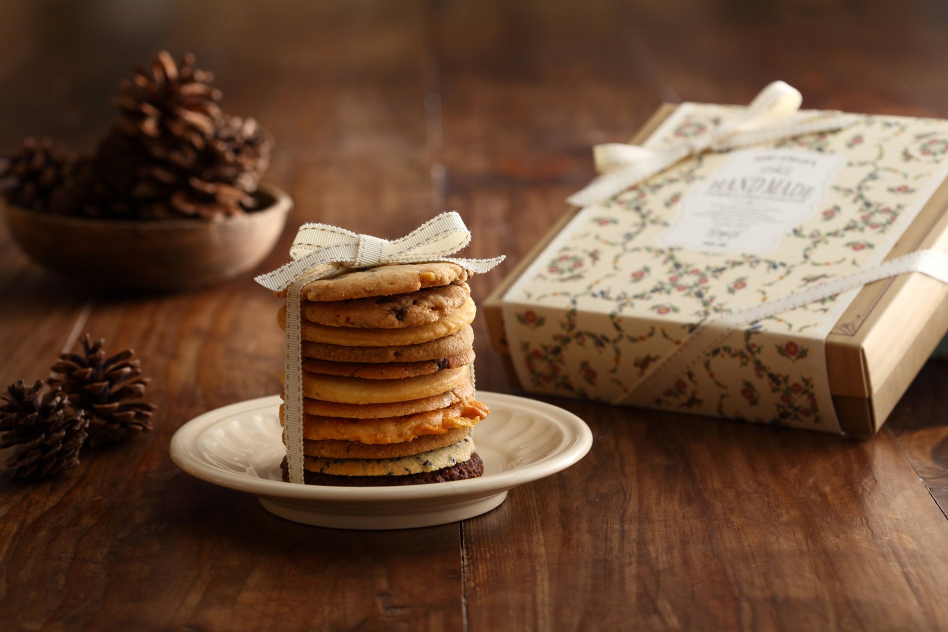 Ozdoby choinkowe, szyszki i orzechy na czerwonym tle