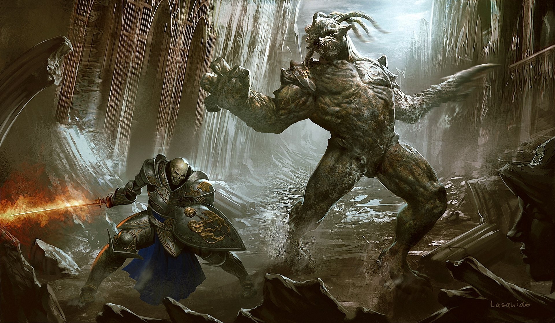 Sztuka: nieumarli i potwory na tle ruin i opuszczonych budynków w wąwozie