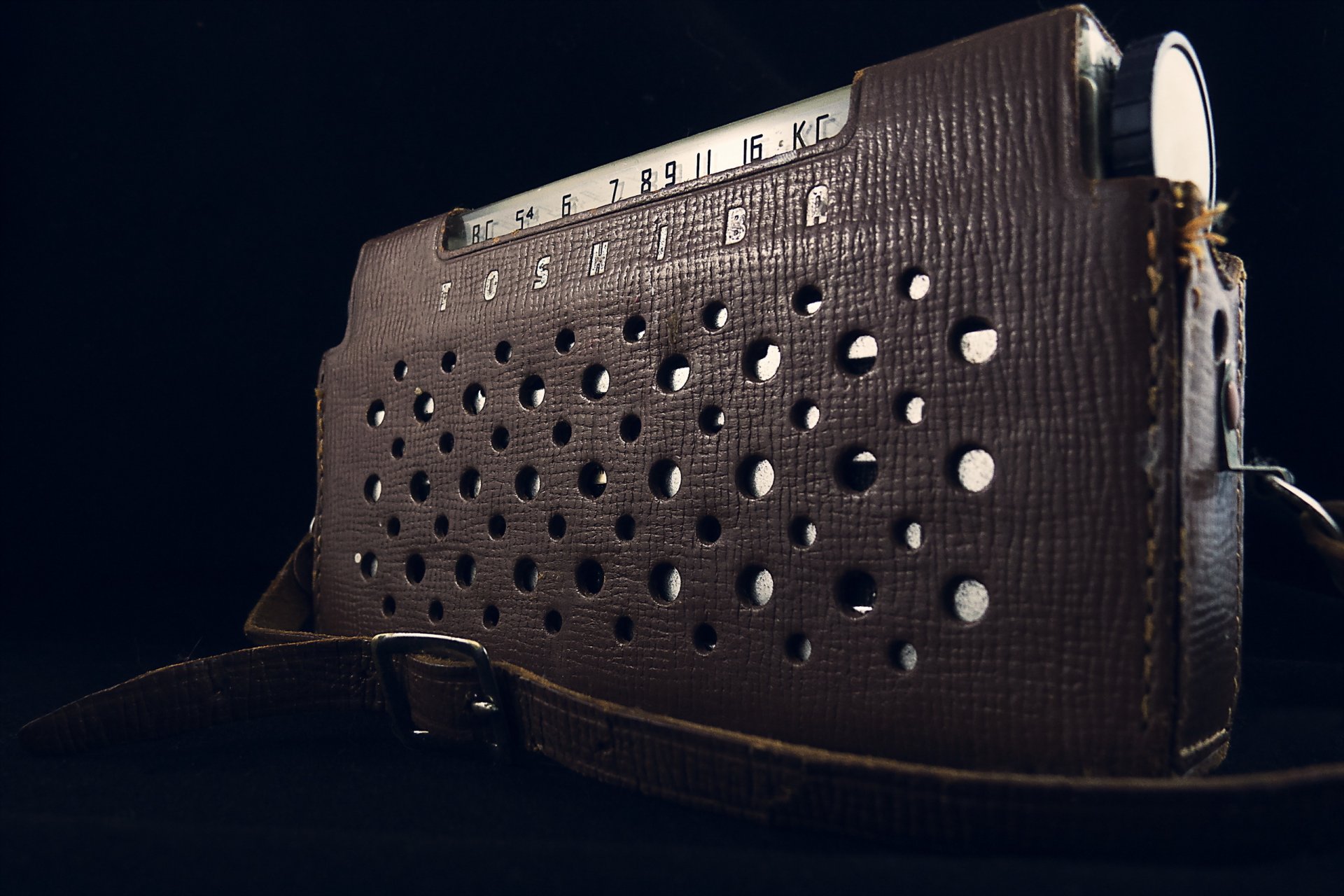 Aparat w drewnianej skrzyni. Zdjęcie makro w sepii