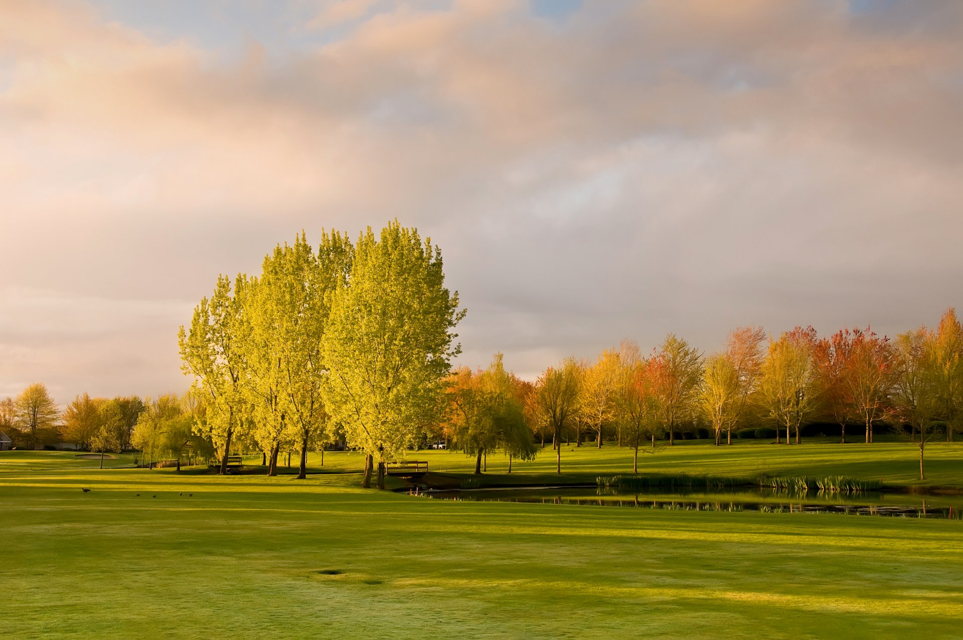 Wczesna jesień. Zielona trawa w parku. Duży staw z mostkiem