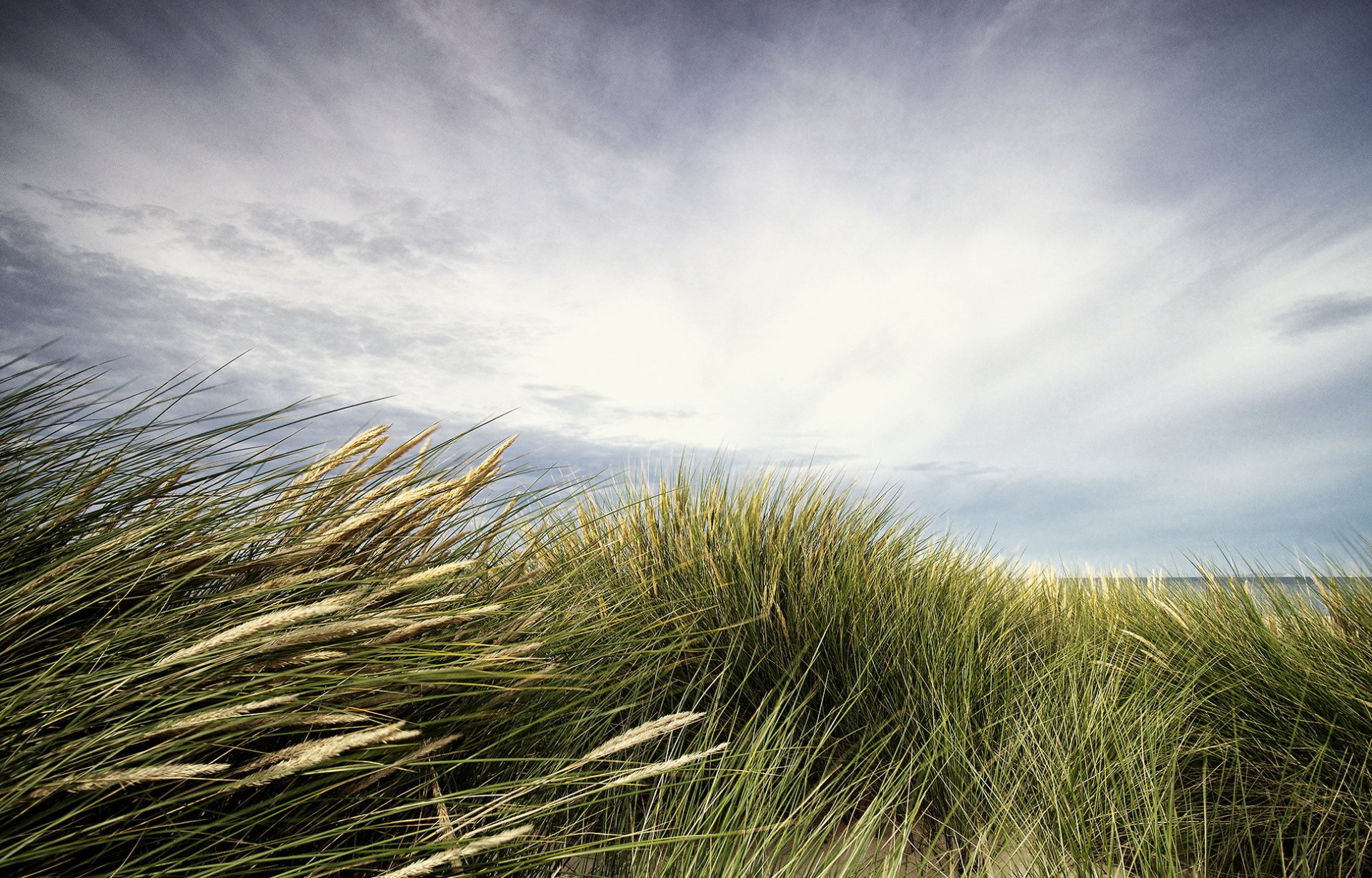 Wysoka trawa na tle jeziora i błękitnego nieba