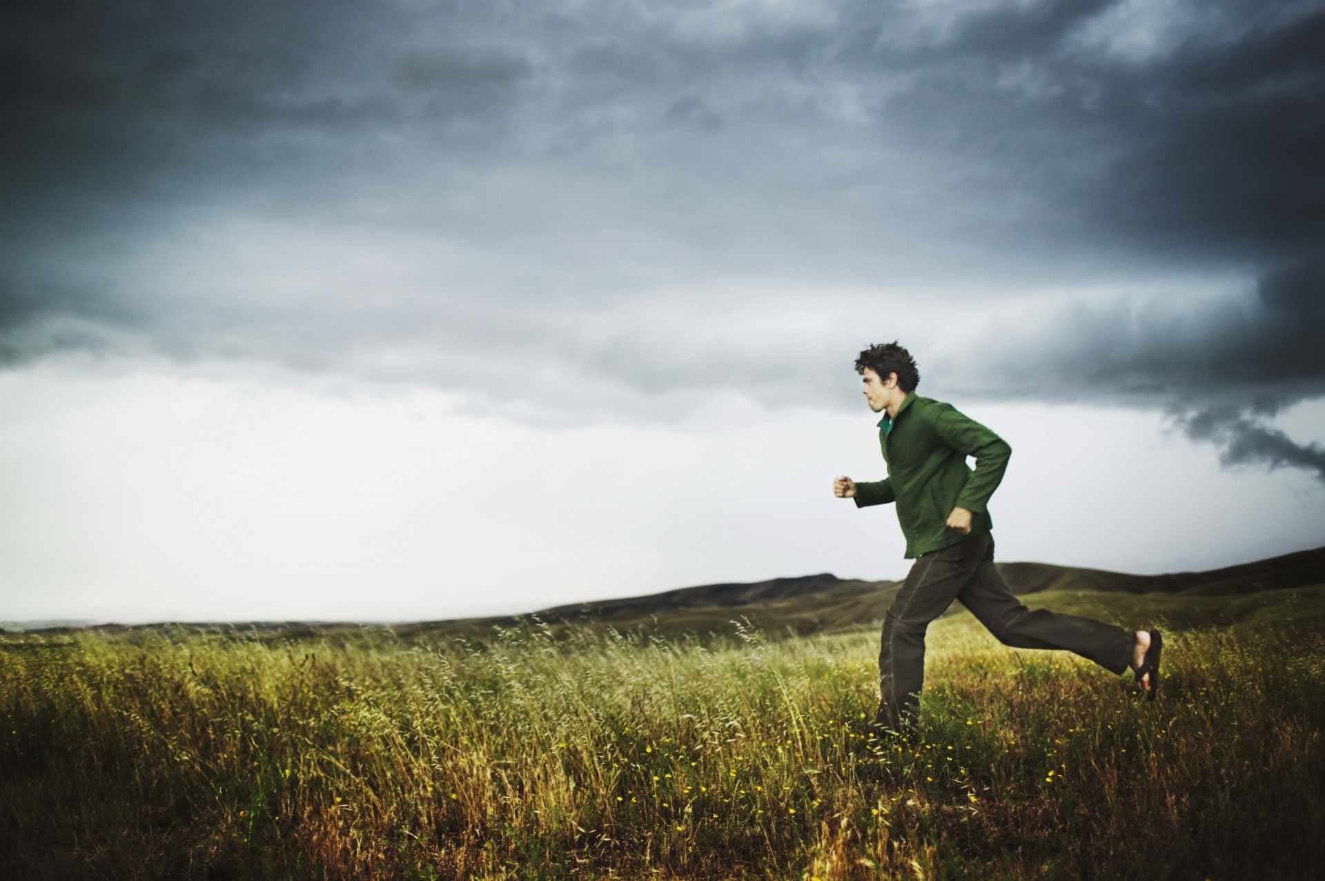 Mężczyzna biegnie po polu w pochmurną pogodę