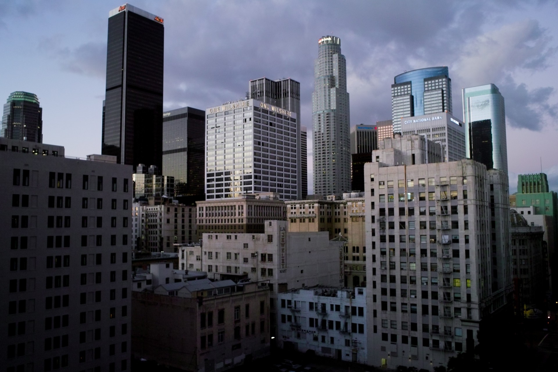 Drapacze chmur w USA odbijają się w nocnej wodzie