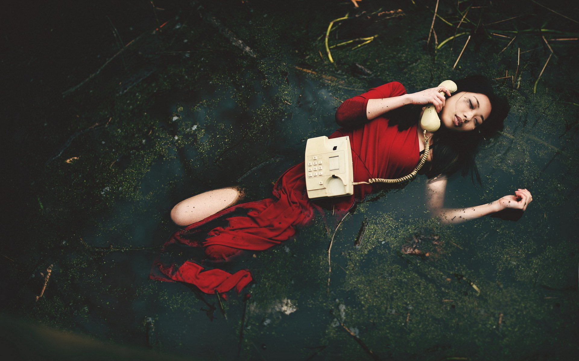 Dziewczyna w czerwonej sukience z telefonem leży w bagnieDziewczyna w czerwonej sukience z telefonem leży w bagnie