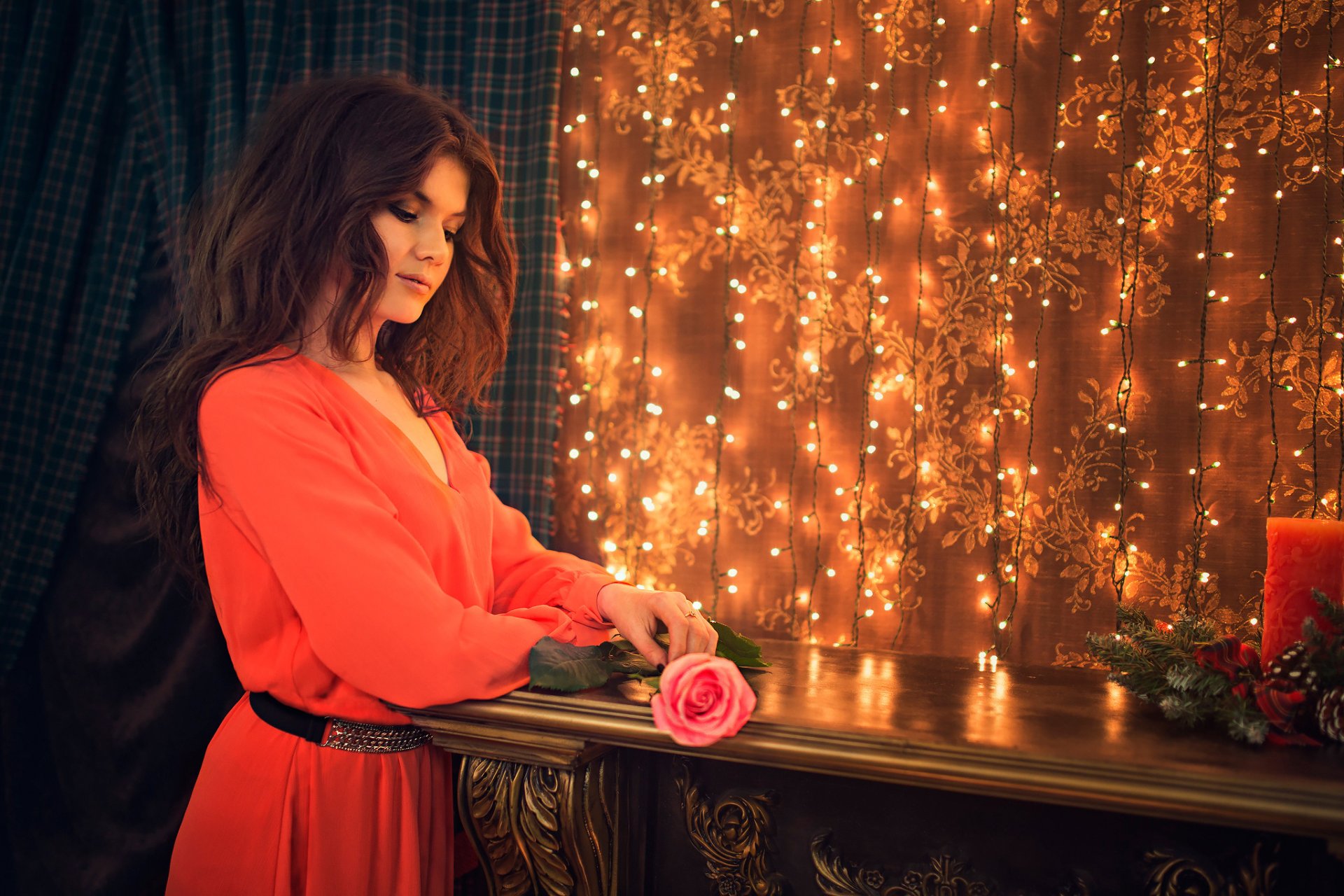 Dziewczyna w czerwonej sukience siedzi przy fortepianieDziewczyna w czerwonej sukience siedzi przy fortepianie