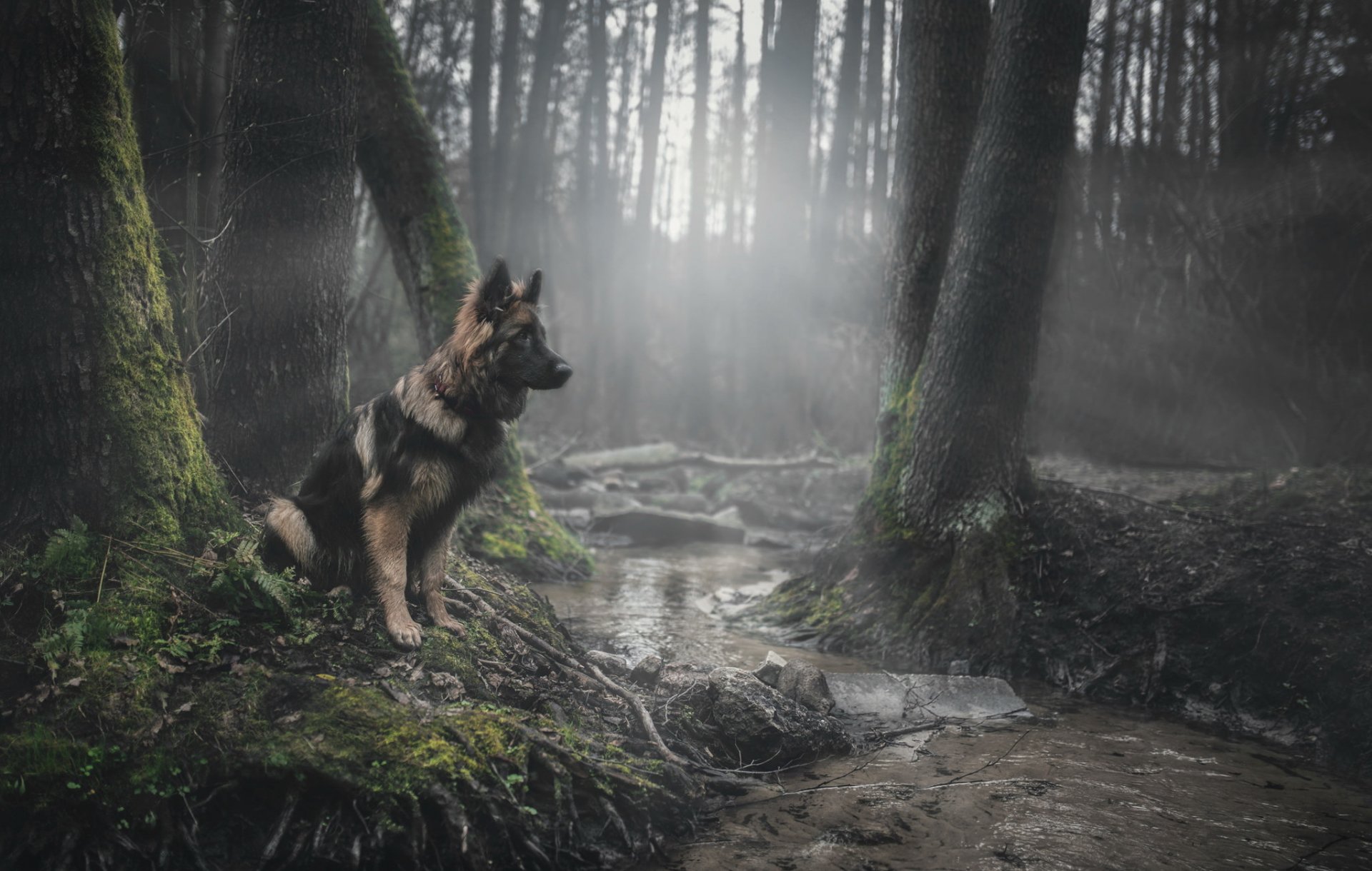 Piękny Owczarek w mglistym lesie z promieniami słońca