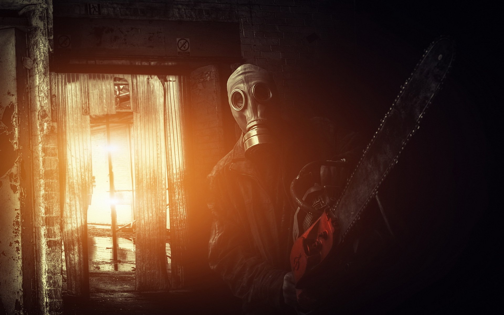Mężczyźni w masce gazowej w półmroku. Klimatyczne zdjęcie