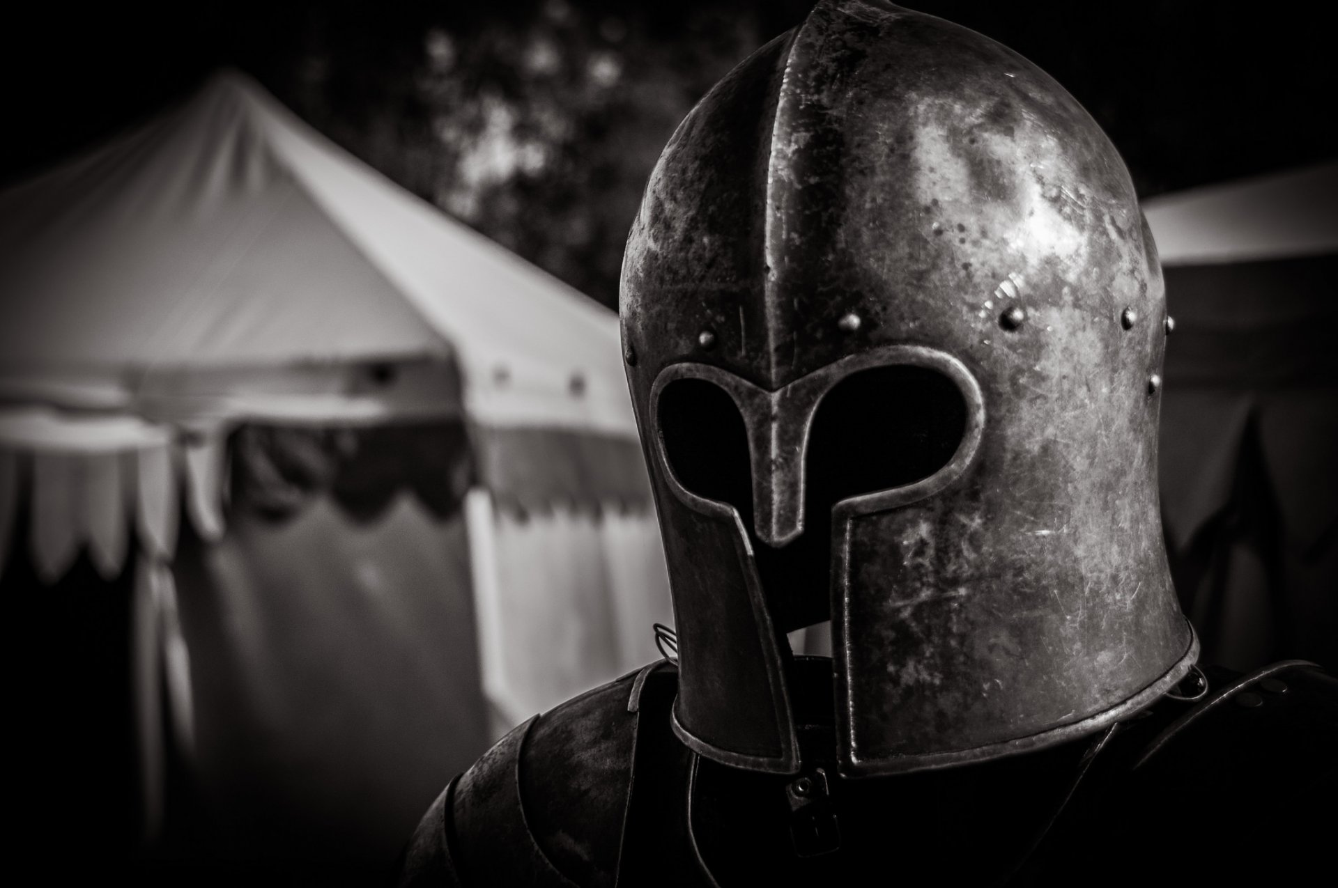 Rycerz w zbroi w obozie namiotowymświetne słońce