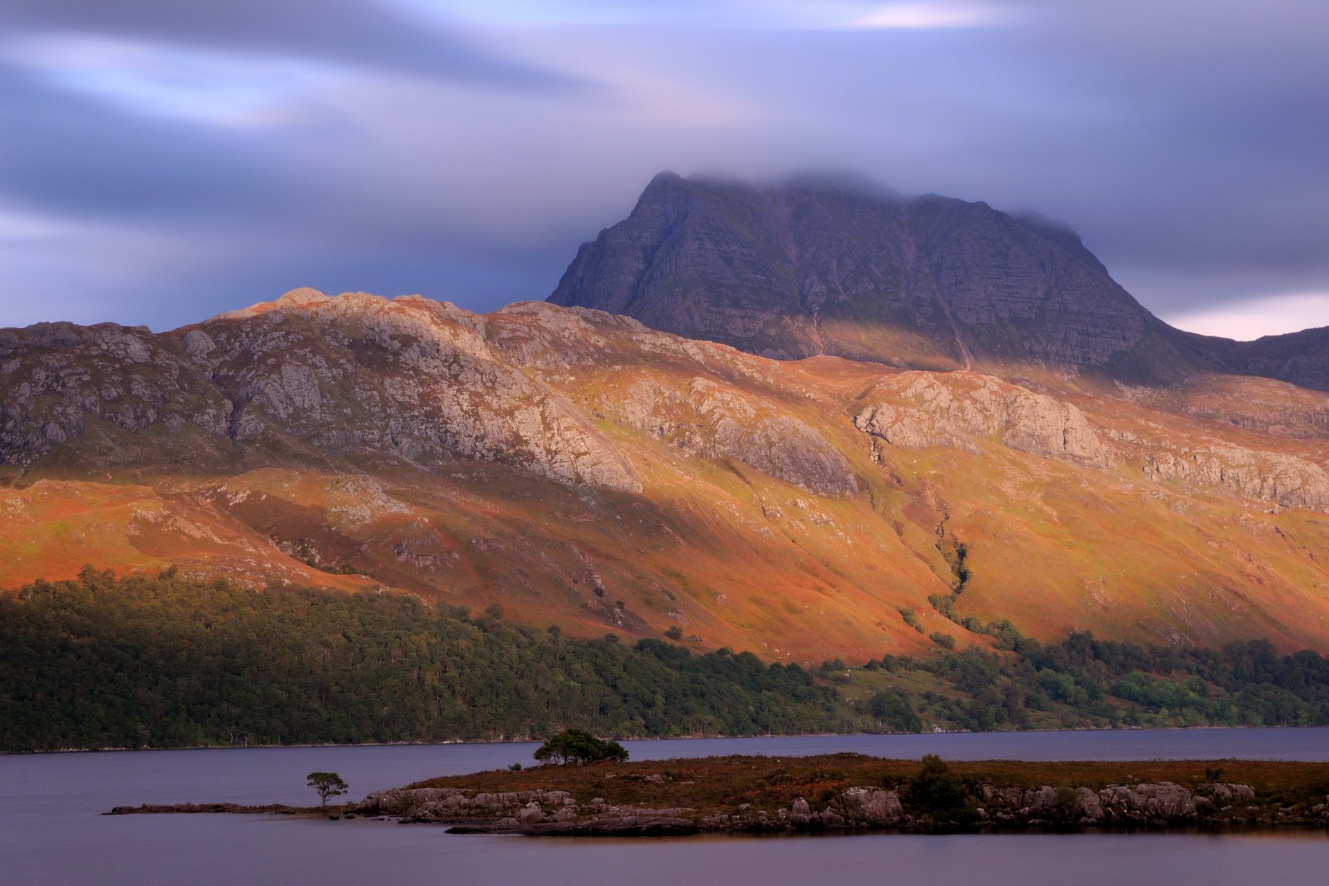 Zachód słońca nad jeziorem i górami w Wielkiej Brytanii