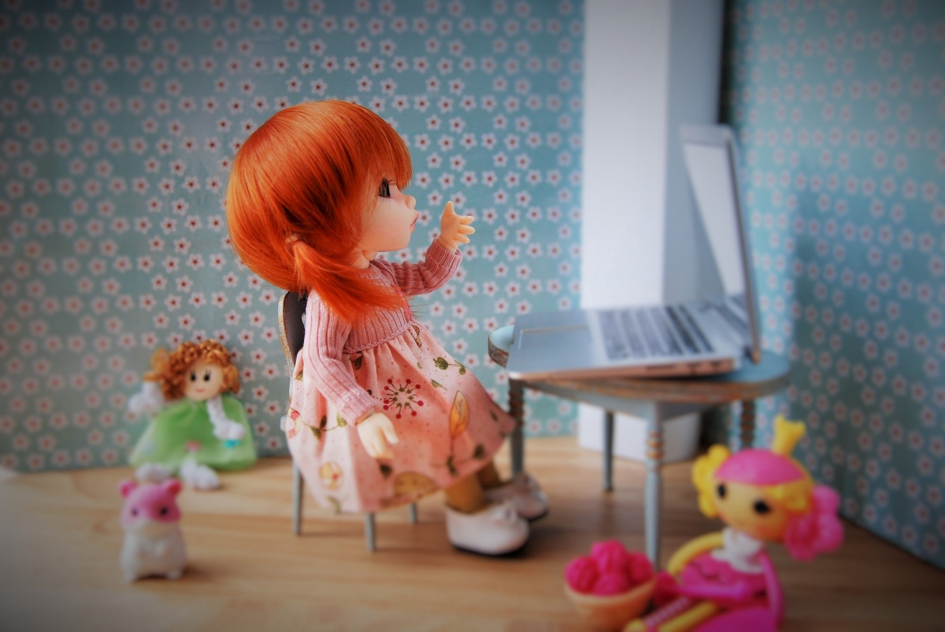 Lalka w różowej sukience. kompozycja lalek. lalka za laptopem. lalka z ognistymi włosami i jej przyjacieleLalka w różowej sukience. Kompozycja lalek. Lalka za laptopem. Lalka z ognistymi włosami i jej przyjaciele