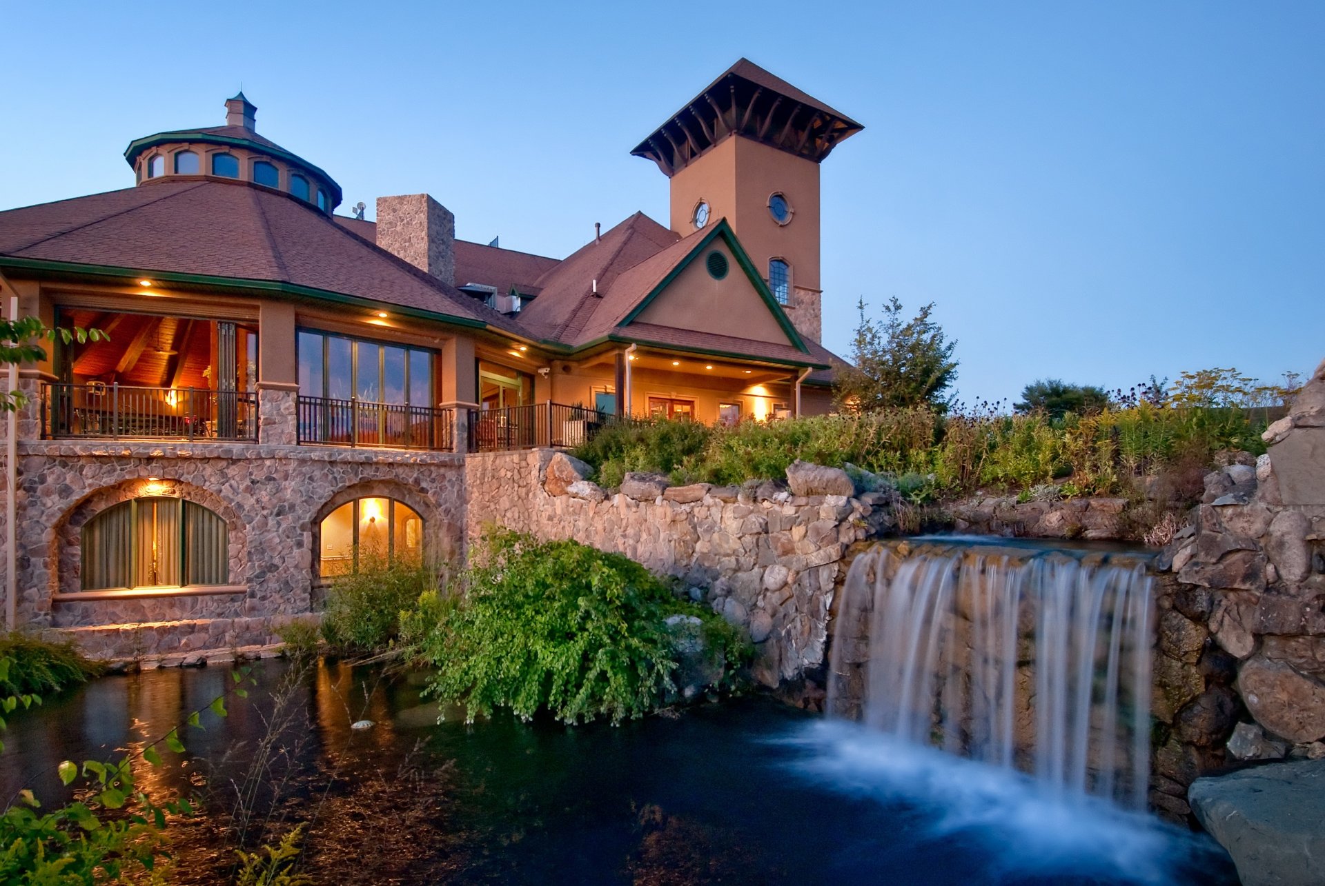 Willa ze sztucznym wodospadem i stawem