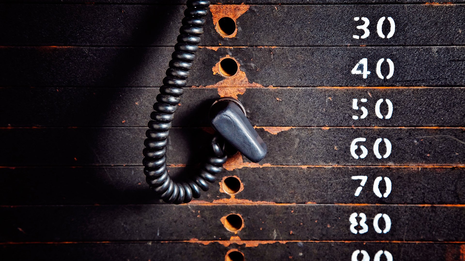 Czarno-biały obraz hantli ułożonych w rzędzie