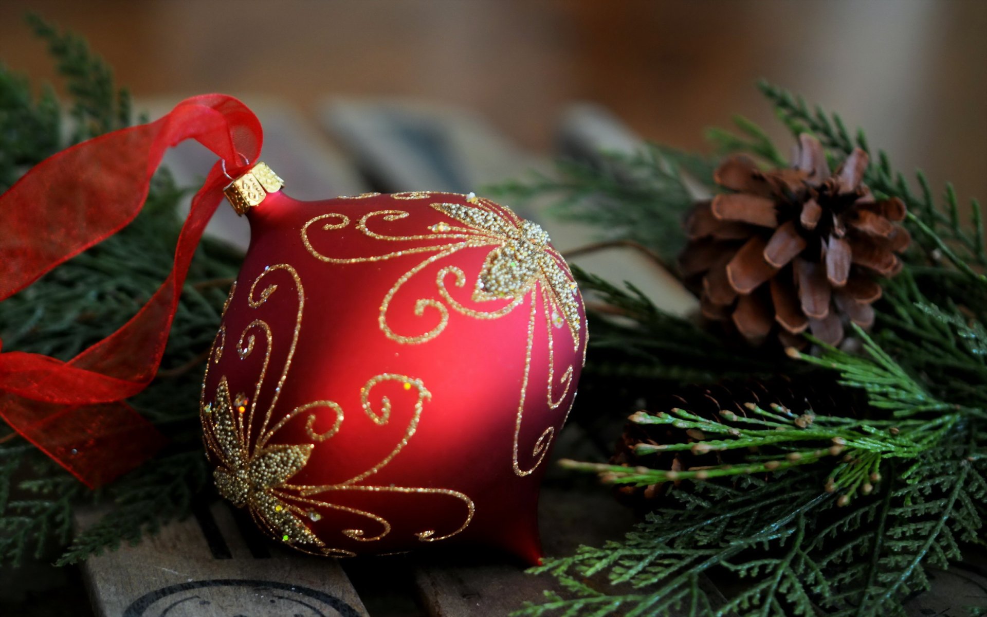 Świąteczne zabawki na czerwonym tle
