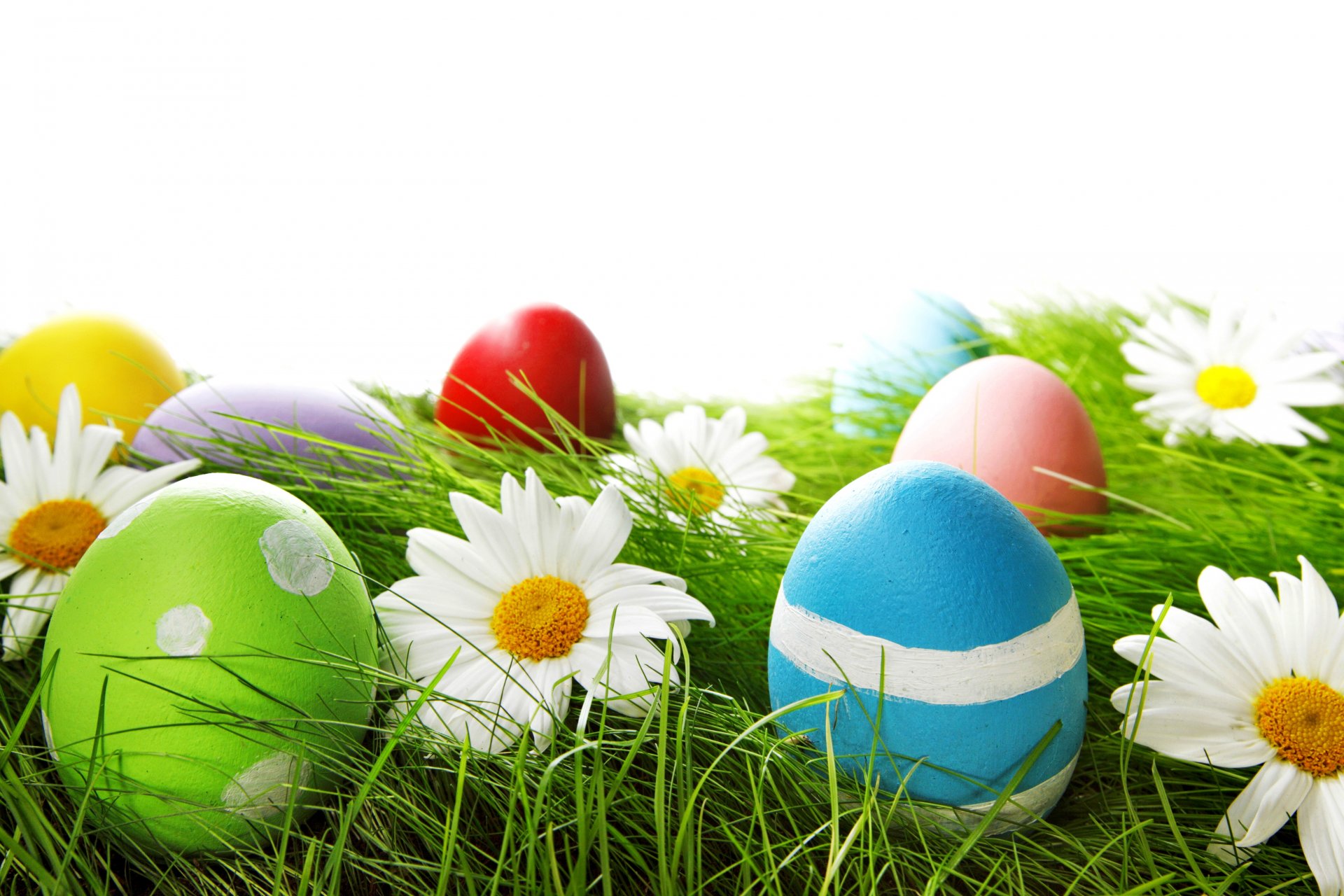Koszyk wielkanocny z pięknymi jajkami i kwiatami